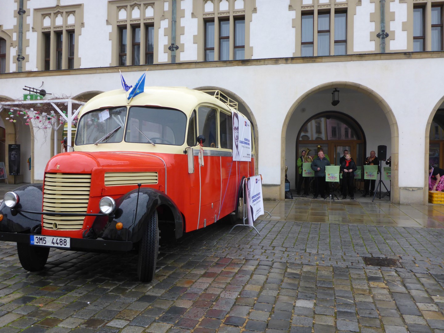 While I was in the town square an old charabanc pulled up and a brass band got out. Placing themselves under the arcades they started to play and sing some tunes which, it soon became clear, were part of an election rally on behalf of one of the EU election candidates. It was raining by now and there were more campaigners than there were electors but they soldiered on gamely. I videoed some of it and was bemused to have first sausage, then cake offered to me along with their campaign leaflets. I was brought up to be polite so I gratefully accepted what I was offered. The sausage was nice, the cake was delicious and the leaflets went in the bin once I was out of sight.