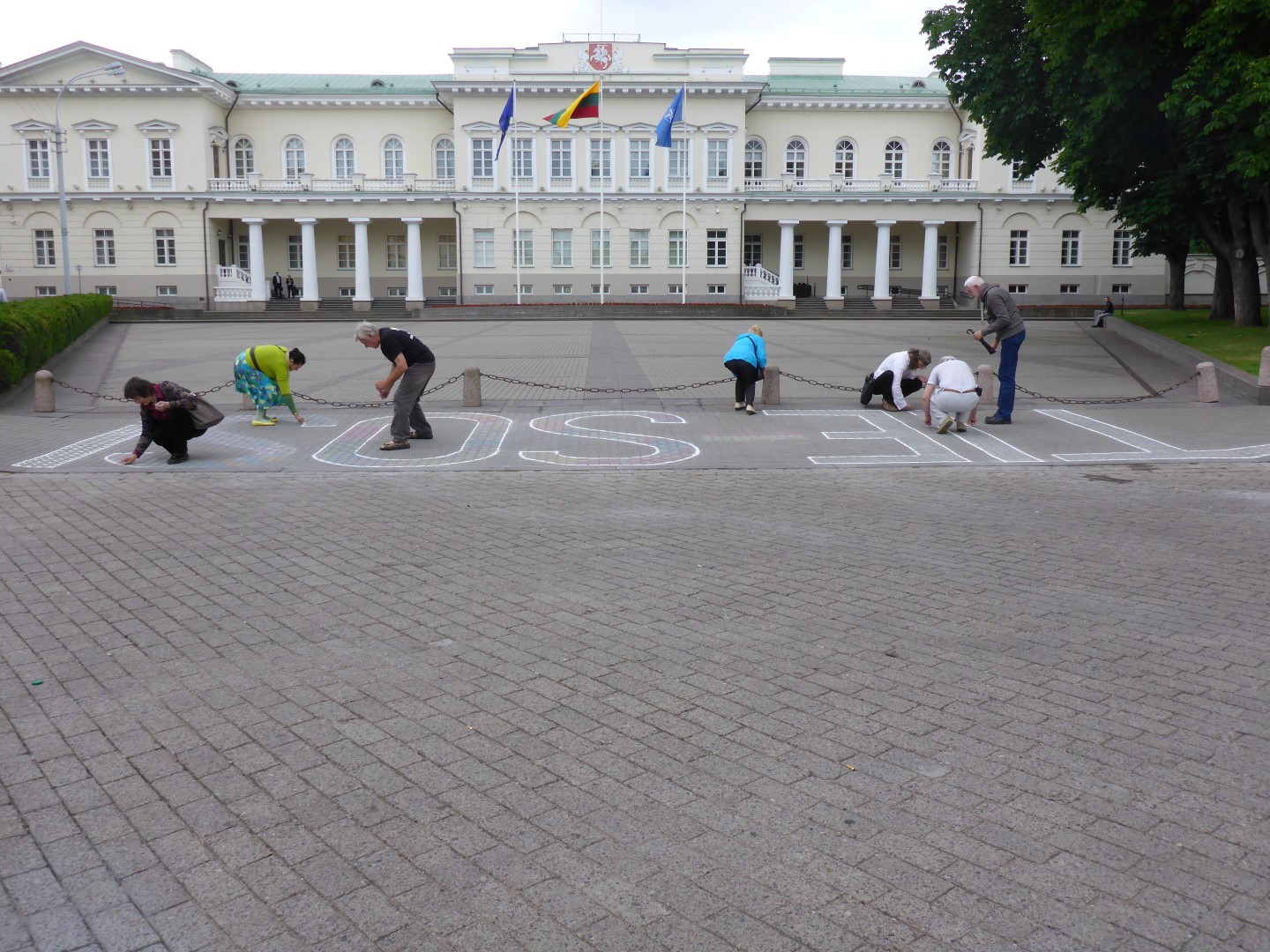 There are some great buildings in the Old Town including the Town Hall, the University and the various churches, and there are some of the old fortifications still left up on the hill above, now a museum. I walked round to where the President’s Palace was and, although it’s a fine looking building, what was happening outside it proved to be far more interesting than what went on inside. There were some people drawing the letters TIE-SOS on the edge of the square in front of the building. Puzzled by this I asked one of them what it was all about. The letters stand for ‘Save Us From Them’ or something similar and behind it lies a very dark tale. They are protesting about the lack of action in a pedophilia case that involves some important figures in the Lithuanian establishment, one a judge and one a politician. The protesters initially came every day to redraw the letters because they used to be removed by the police but they get left alone now so they only need to come once a week.