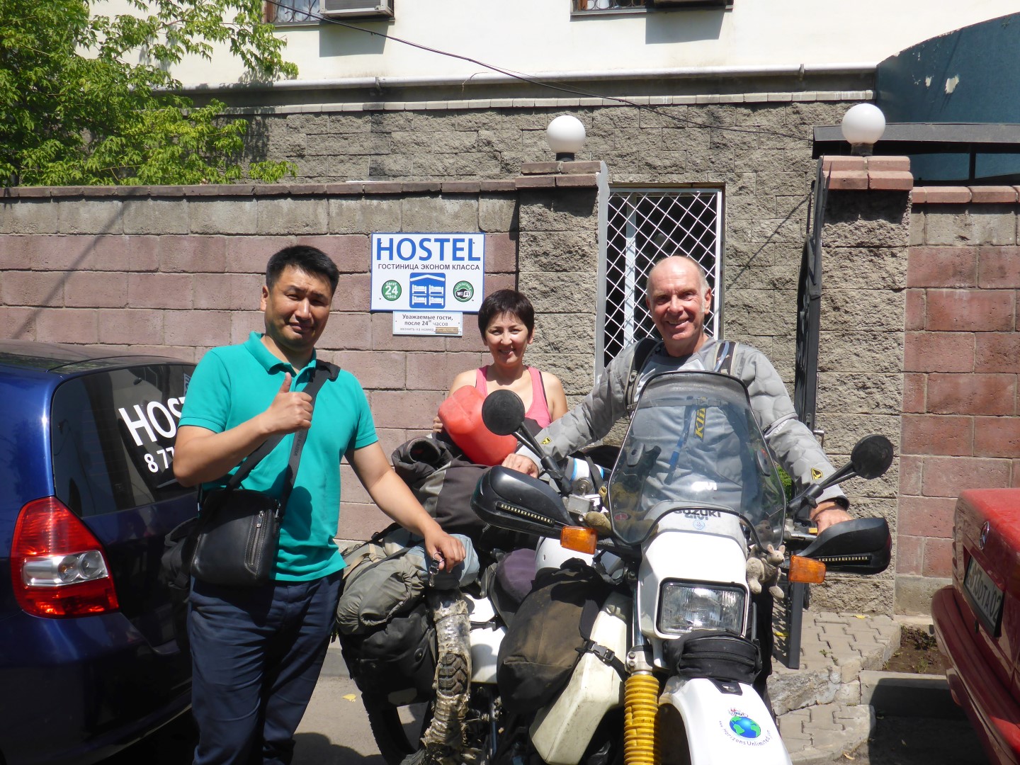 My decision now was to head back to Almati for repairs especially after checking my stock of spare parts only to discover I’d removed the spare wheel bearings to save weight and room. Bugger! It was just over 100km back to the city. Fortunately I’d taken one of the hostel’s cards so I had an address to head to. All I had to do was find it again. As I was riding the noises from the bike were getting worse, so bad in fact that I was beginning to wonder if it was the gearbox. The speed I rode at seemed to make no difference so I just got there as quickly as I could. Once in the city I just rode around, hoping to see something I recognised. After a while I stopped by the side of the road for a think and a local biker pulled up to see if he could help. I showed him the card and, with a bit of consultation from a friend on the other end of the phone, led me right to the place. Fantastic! Yet more biker/Kazakh friendliness. I couldn’t thank him enough for saving me endless time riding around a busy city on a stinking hot day. Alex gave me his business card In case I might need any more help and, ironically, he works for a bearing supplier!