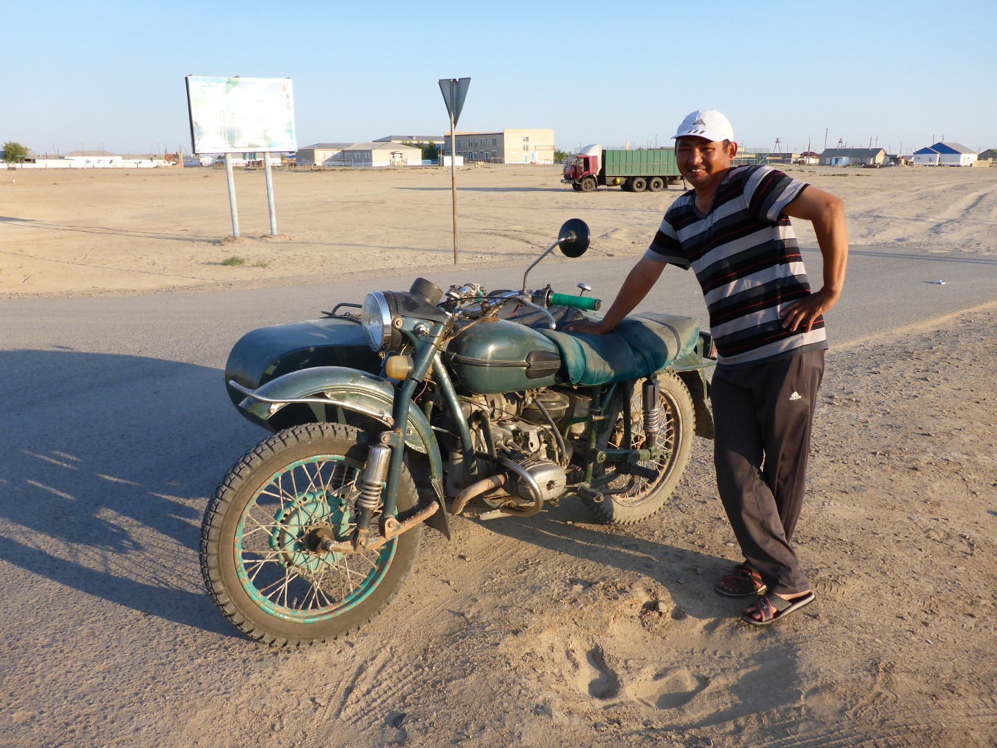 The time the repair cost me meant I wasn’t going to get to Atiraw that night so I stopped in a small town and asked about a hotel. The message I got was ‘not here but there’s a town about 30km further on that has one’. Good enough for me so I kept on until I reached a town called Aqqistaw. I stopped at a shop to ask a guy who was unloading his van and he seemed to be a bit confused about whether there was one 30km away or 1km. Just then a woman came to the shop, heard what was going on and said ’Follow me’. So I did and she led me to a nice hotel where I got a room. After getting out of my sweaty riding gear I went downstairs and enjoyed a nice meal. Afterwards the receptionist relieved me of T8,000, to cover the room, meal and breakfast, smiling sweetly as she took all my remaining money. When I arrived in Kazakhstan I’d had the impression that things would be quite cheap so I was a bit shocked by this but when I worked it out, at an exchange rate of about T310 to the pound, it was £25 for an en suite room and two meals. Not as bad as it seemed at first and when I’d arrived I hadn’t asked about or negotiated the price, so I only had myself to blame. But it did seem like a lot of money in a country that sells petrol at 37p per litre. The owner of the hotel insisted I put my bike in the stairwell that led up to the rooms, even though I thought it would be safe enough around the back of the hotel. It was a bit of a struggle but we did it in the end.