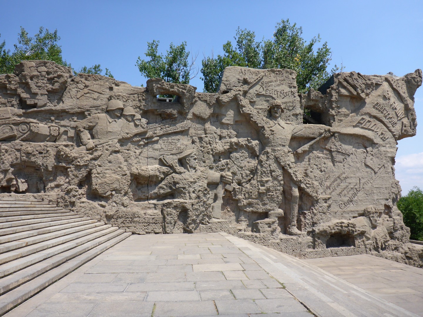 My first destination was the memorial site on Mamayev Hill. During the battle for the city this place changed hands eight times. There are a whole variety of memorials, the main one being ‘The Motherland Calls’ statue. It is the figure of a woman calling the sons of the Motherland to fight in its defence. It is eighty metres high, including the sword, and looks pretty spectacular. The other big statue is of a soldier, gun in one hand, grenade in the other. The inscription includes the famous words of the General leading the defence: No Step Backwards, Stand to Death! These words were reckoned to have given extra determination to the defenders. There’s a cylindrical building which contains an eternal flame and on its walls are the names of those who died. There’s a whole host of other artwork around the statues, most of it in typical Soviet style. There’s never any doubt about what any of these displays are trying to say to you. ‘Subtle’ is not an applicable word.