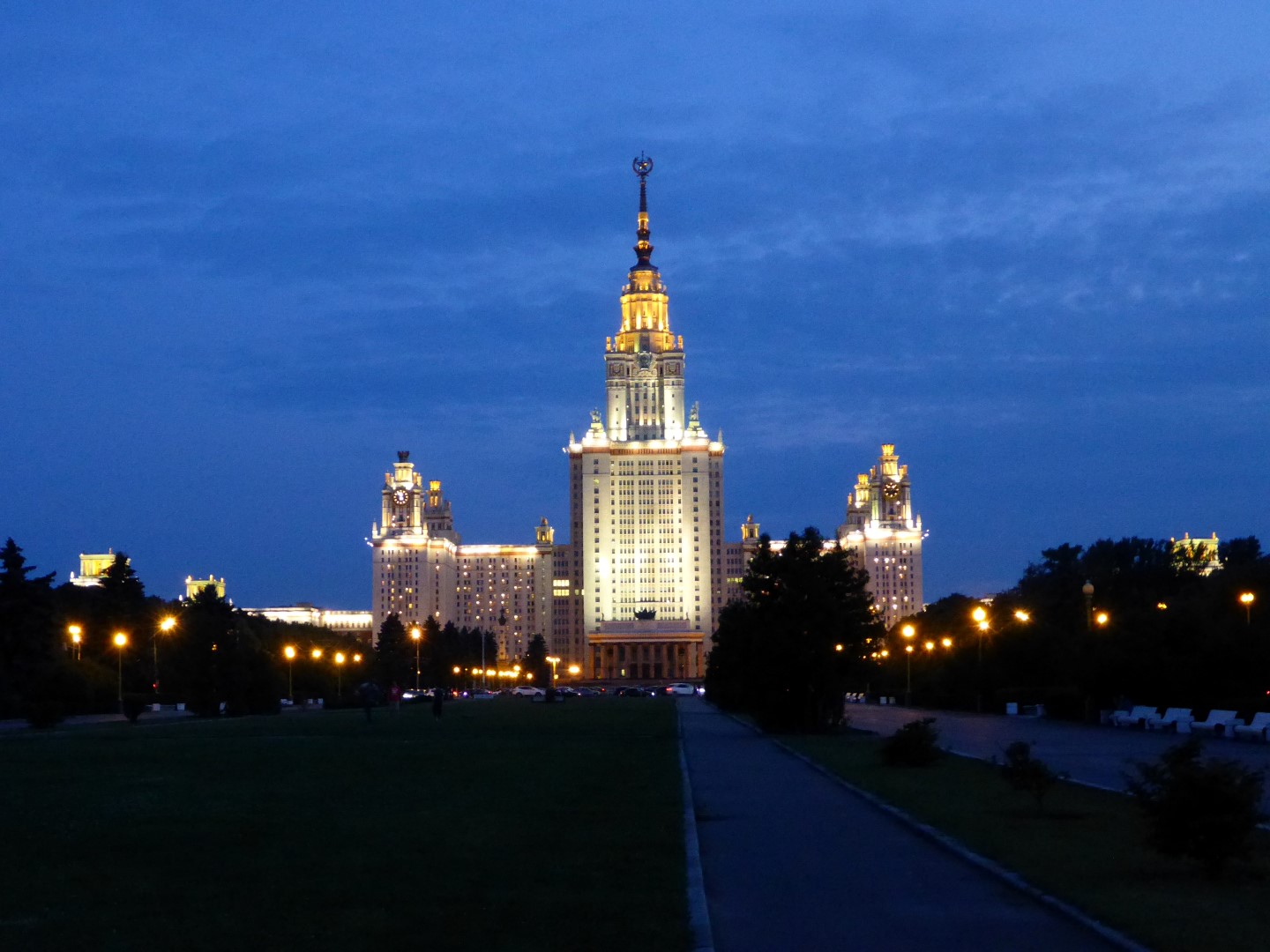 After a while Andrey suggested we go out to have a look around some of the city. This was about 22.30 and yet it was only just getting dark. So we all piled into their Suzuki 4×4 and drove around to some places that I would never have found on my own. They showed me Moscow’s new financial district, called Moscow City. This area has Canary Wharf type skyscrapers in it, some of them very stylish in appearance. We drove up to a park called Vorobyovy Hills which opens out onto a plateau where bikers meet at night and where there is an amazing view out over the city, all lit up below. This park is in front of the Moscow State University, a huge building of which the city is justly proud and which looked very nice in its night time illumination. We drove down to Red Square and walked around admiring the beautifully illuminated buildings – The Kremlin Walls, St Basil’s Cathedral and GUM, the famous Moscow department store. We also drove round to the building that used to house the Moscow State Circus which has some amusing statues outside it.