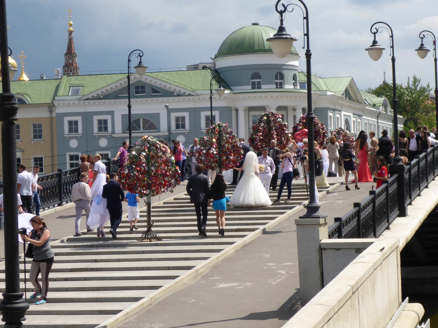 On today’s agenda was a city bus tour. I’d discovered during my holiday with Jan in Cape Town that this can be a great way to see and learn about a city. They have multi lingual commentary which switches on as you reach given points along the route. I took the metro to where I thought the route started only to find I’d been misled by an out of date tourist map. I got to the right place eventually and while I waited for the bus I was watching a number of wedding parties posing for photos on a nearby pedestrian bridge over the Moskva River. I discovered that it is common in Russia for wedding parties to go somewhere special to pose for the photos, such as a park or a significant landmark of some kind. There were several parties there with the nicely decorated cars parked nearby. It seemed a great way of going about it especially on such a lovely sunny Saturday.