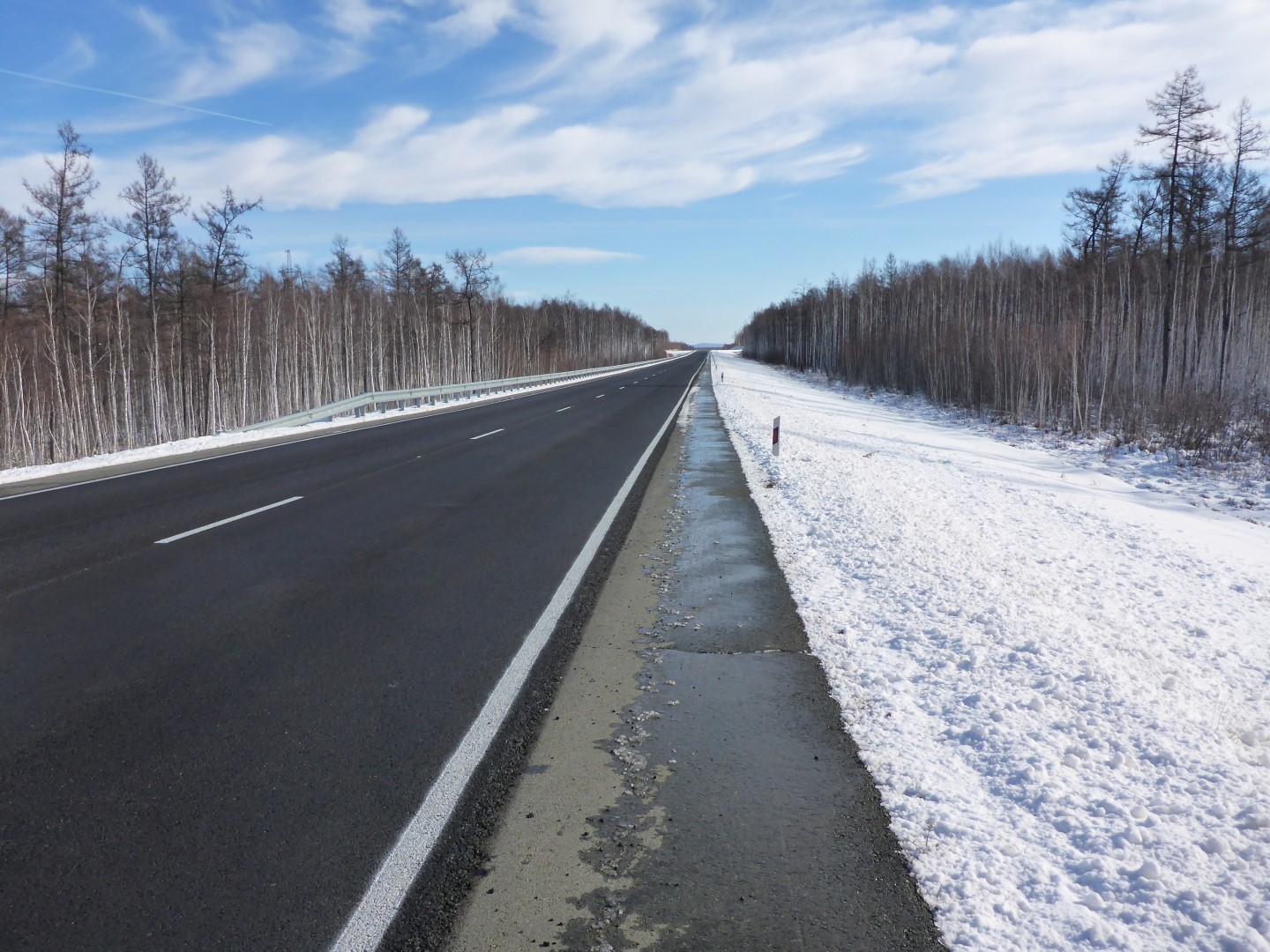I spent my time writing, partly because I needed to catch up and partly to take my mind off my predicament. While the blizzard was raging I had no way of knowing if this was the Siberian winter setting in. Would I be stuck here until May with nothing to do but write and improve my Russian? No wi-fi and no mobile phone signal either. Lost in Siberia, no communication with the outside world? Common sense and logic prevailed. I knew it was too early to be proper winter and the behaviour of the truckers told me they were just sitting it out and waiting for it to clear up. By Monday morning it had melted enough for the road to be clear of snow. There was still plenty along the roadside but whatever methods the Siberians used for snow clearing, they seemed to have worked. I had no choice but to leave anyway as I was swiftly running out of cash. I showed the map to the woman who was in charge and gleaned the information that the next town had a Bankomat, there was another hotel further along the road but that everything was ‘balshai’, which I took to mean a long way apart. OK. That was enough info for me to feel that, on a bright, sunny morning, it was worth taking a chance. To be honest I was glad to be leaving. The staff at the hotel were a pretty off hand bunch, both in the cafe and those who looked after the rooms. None of them made any effort to allow for my lack of Russian or attempted to be friendly. I know there’s no obligation to do so but up to now everyone else had. Possibly fed up with having to deal with an idiot foreigner who shouldn’t even be there. Happy in their work? I think not! I was glad to get out for many reasons.