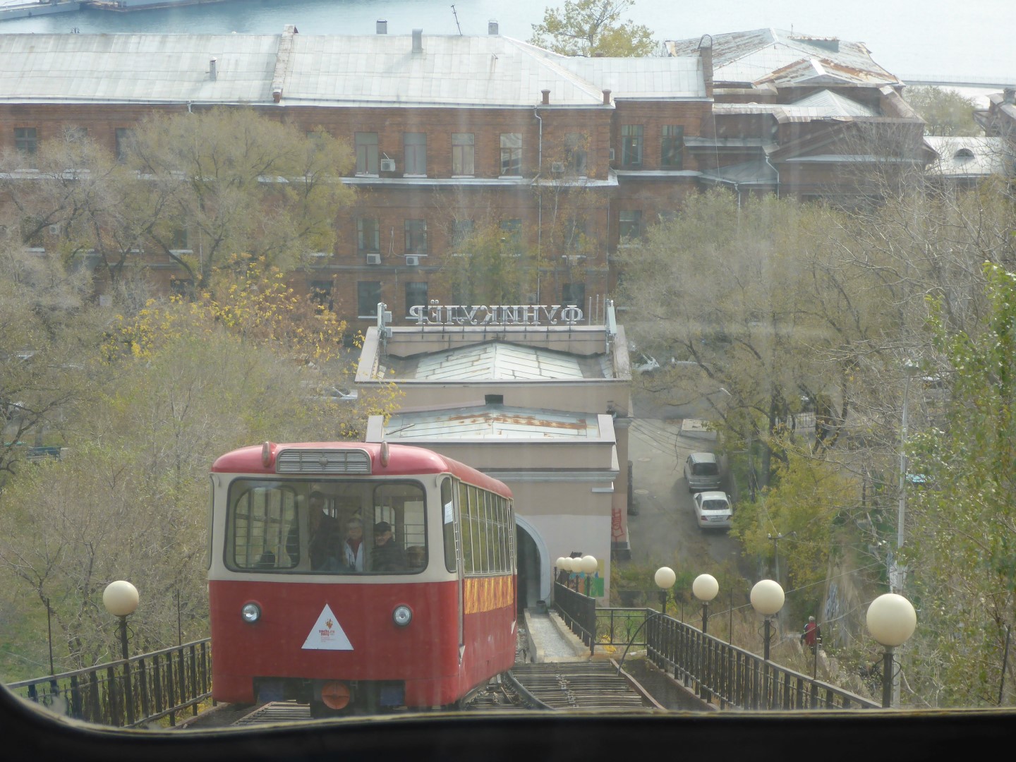 Yuri had mentioned a funicular railway which goes up one of the steep hills to the Eagles Nest, a viewing point on one of the city’s highest hills. A nice little train at a nice little price took me up and once I’d walked up to the top I could see why the lookout was so popular. The view over the city and the harbour was pretty special, even on a dull October day. There were several navy vessels moored there, along with a three masted sailing boat. Vladivostok has a bit of a special feel to it, partly due to its history and architecture and partly to its status as a naval base. It sits at the end of the Trans Siberian Railway. Catch a train there, you wont regret it. I’d looked around the railway station earlier and was very impressed by its design and some of the artwork on it. It was designed to be a twin to the departure station of the railway in Moscow. It really does look stunning.
