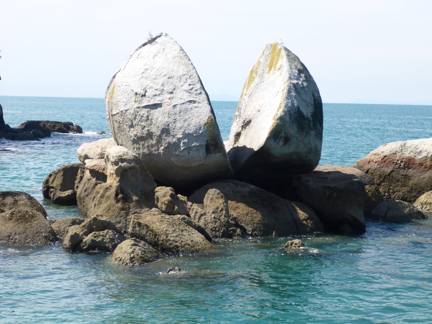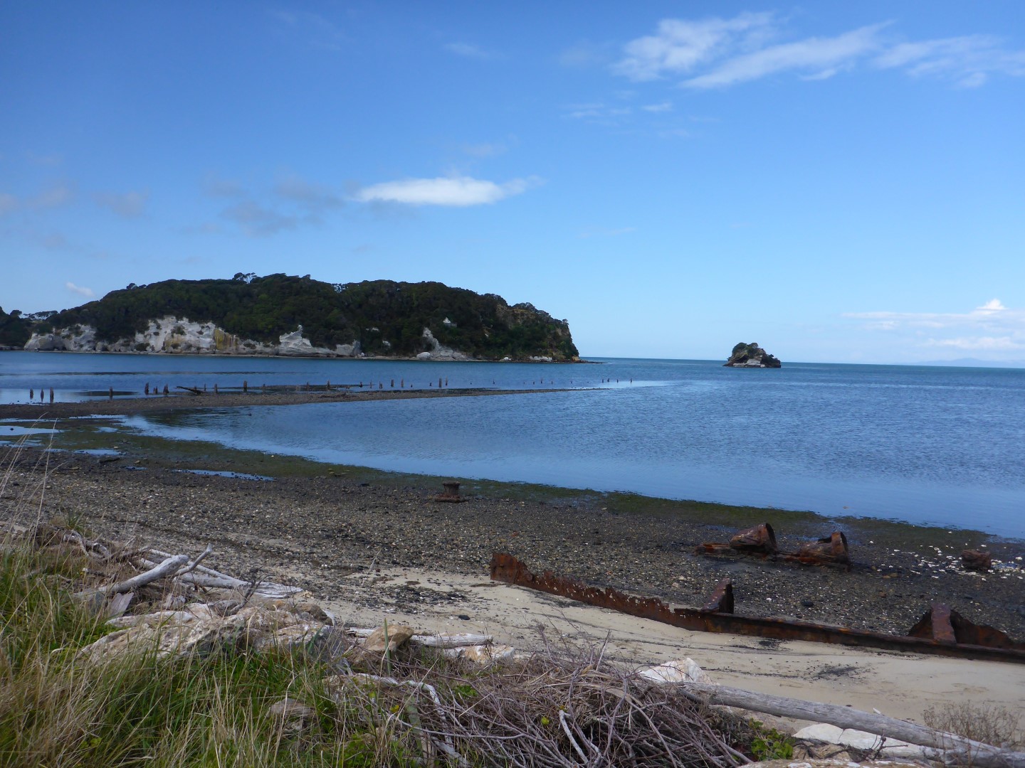 Having spent some of my time dealing with shipping and Carnet issues, I felt the need for some wind and fresh air so I took off on my sweet running, freshly serviced bike to explore the peninsular north of Nelson, which includes the Abel Tasman National park. A ride up through Motueka and Takaka got me to Collingwood, the most northerly town on the south island as far as I could tell. Not far past that lies Cape Farewell and the Farewell Spit. I was pleased to be able to park the bike up and take a walk around some of the viewing sites that the DOC thoughtfully provides. Farewell Spit is scythe shaped tongue of land that curves its way across the top of Golden Bay and is a very important bird sanctuary, so access is limited. However I enjoyed a warm, sandy walk down to one of the beaches where I could admire some nice tree covered clumps of rock that had been separated from the land by erosion. Yes OK, I’m easily pleased!