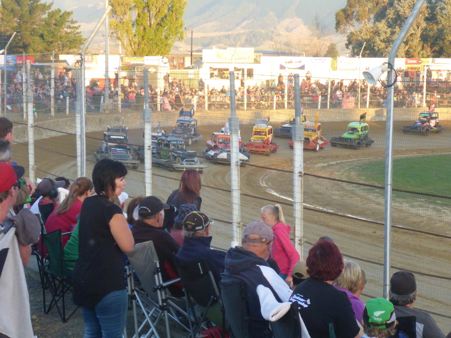 Saturday evening was Speedway. Not bikes on this occasion, although that sport is very popular in NZ. ‘Speedway’ involves cars and is what we would call Stock Car racing. It takes place on a sandy, oval track, and caters for various classes of cars including Super Stocks, Production Stocks, Mini Stocks (for young racers) and TQ’s. These are very small cars that use 750cc motorcycle engines, mostly Suzuki. The racing began on the dot at 7pm and was fast and furious. Dashes, bashes and crashes in abundance, excellent value for our £7.50 entrance fee.