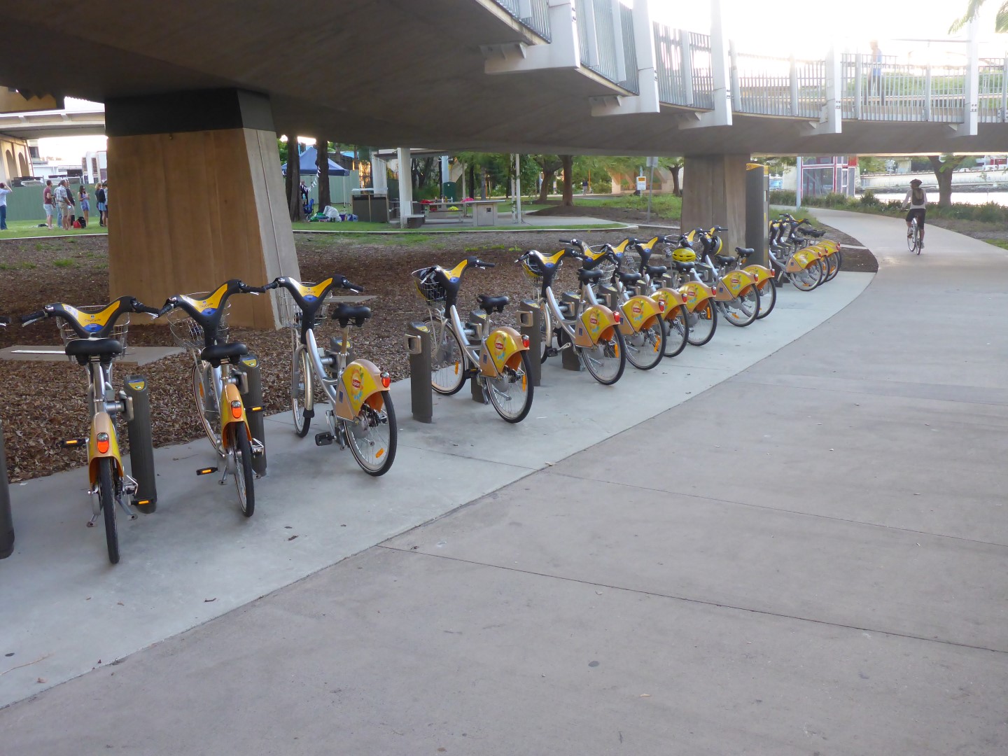 Having been built by a river the city has several bridges and we crossed over a couple of them as we cycled along each side of the river. Most cities are built by rivers, for fairly obvious reasons, and most of the city authorities attempt to make something of the location by way of providing riverside walks, rides and public spaces. Brisbane has a nice Botanic Garden, a very pleasant swimming area, some great, plant covered walkways and a maritime museum too. It’s not all wine and roses though. Two years ago the city suffered badly in the severe floods that hit the region, losing a bridge in the process. We rode past these areas but also went into the central area to look around a bit and find a coffee. The weather was warm and sunny, even for late autumn, and I definitely enjoyed the exercise.