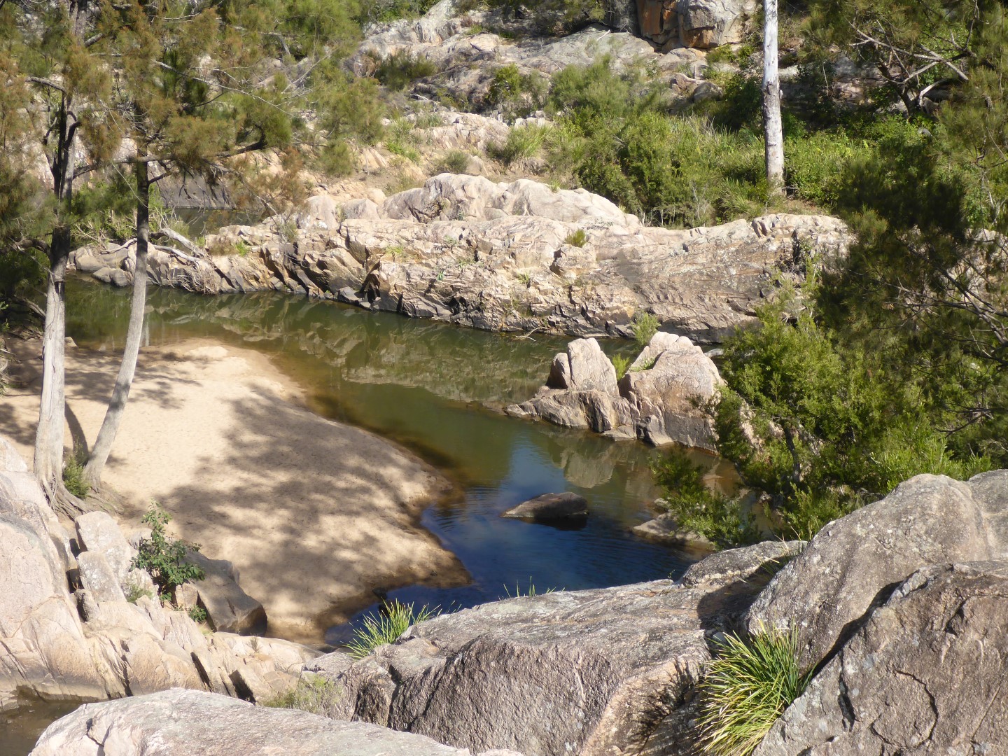 His land borders Crows Nest National park and we continued our walk on through there. It is famous for its granite formations, waterfalls and Rock Wallabies. Granite rocks and water falls are easy to locate but wallabies less so, and we were out of luck that day. The authorities have closed off some access points to the gorge, through which the river runs, after a young man died while swinging from a rope across it. Being a bank holiday weekend there were plenty of people about and we found some rubbish that had been left behind and took it with us.