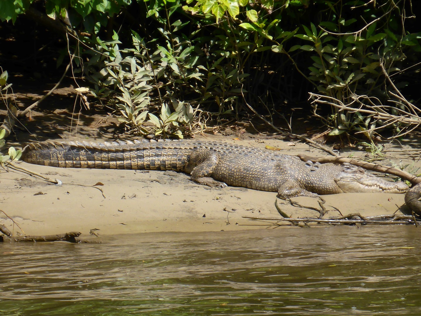 There’s two types, estuarine and fresh water. The freshies are small and almost never attack a human. Their teeth would do some damage but they’re not killers. The salties, on the other hand, are big. Males can be eight metres long and females six, but are more likely to be six and four metres. They can live up to two hundred years, more likely to be one hundred and fifty. About one hundred is average. They are survivors from the Dinosaur age and their survival skills are phenomenal. Their heart rate is forty beats per minute but they can stay under water for up to six hours by reducing that to two beats per minute. They will eat fish or mammals, what ever comes along. If they get a good meal, such as from eating an adult wild pig, they may not eat again for up to a year. Under normal circumstances they don’t see adult humans as prey but they are territorial and can sometimes be seriously hungry. The trick is to avoid needing to have the discussion in the first place! The scales on their back act like solar panels and absorb energy from the sun. Crocs are the least cruel of killing animals. Their pray will die very quickly from the bite and/or by drowning. It seems they get a bit of a bad press in being accused of cruelty. Although they generally prefer the salty, estuarine waters, they can be found a long way inland, maybe 120kms, as they search for food. Than can move overland if they need to and sometimes get stranded upstream in a creek or waterhole after the wet.
