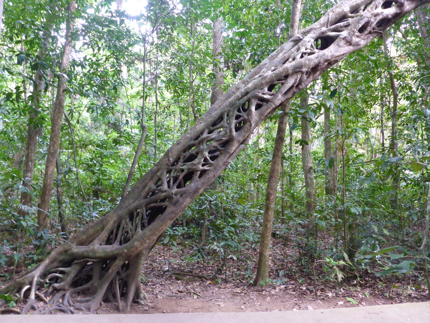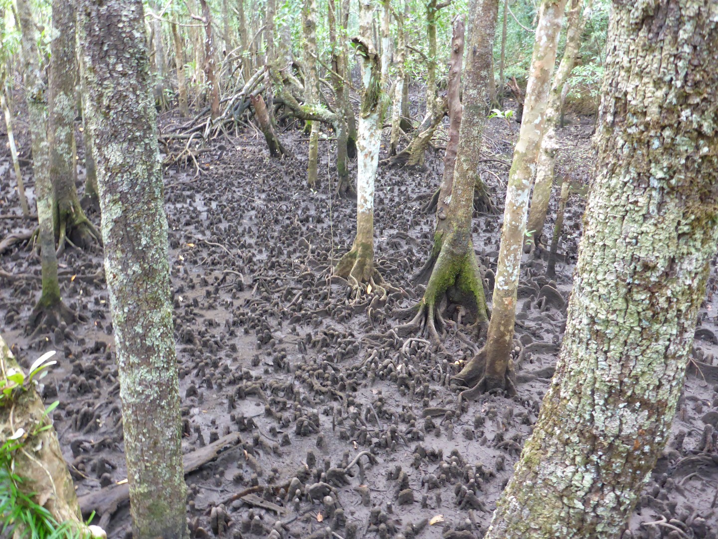 From the road the boardwalk goes into tropical rainforest, then crosses a creek where it enters mangrove forest. The two ecosystems sit side by side, separated by the creek, and they couldn’t be more different. Strangler figs, very tall fern trees, baskets of life etc. Many of which I’d seen before in other places. In the mangrove area, mangrove trees, with their weird root systems. They have a real struggle to survive in the salt water and use special techniques to help them. For example they store the salt they absorb in dying leaves which, when they fall off, take the salt with them. Some of the roots are like hollow pencils which stick up above the water and draw in oxygen. Fascinating stuff.