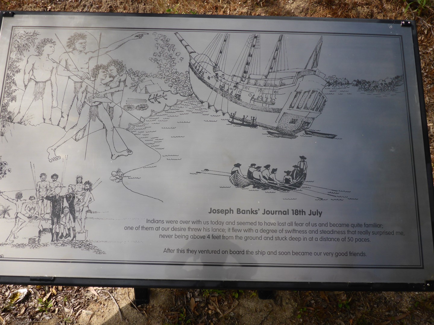 Another place I visited was Grassy Hill. It offers a 360 degree view of the area and Cook came up there often as he tried to work out a route that would escape the sandbars and shallow reefs which blocked his way to the open sea. There is a lighthouse on the hill too, imported from Birmingham in 1885. It’s a peculiar little building, effectively a lamp mounted on top of a corrugated shed. On the road up the hill are various displays telling the Aboriginal story of their dealings with Cook and Banks.