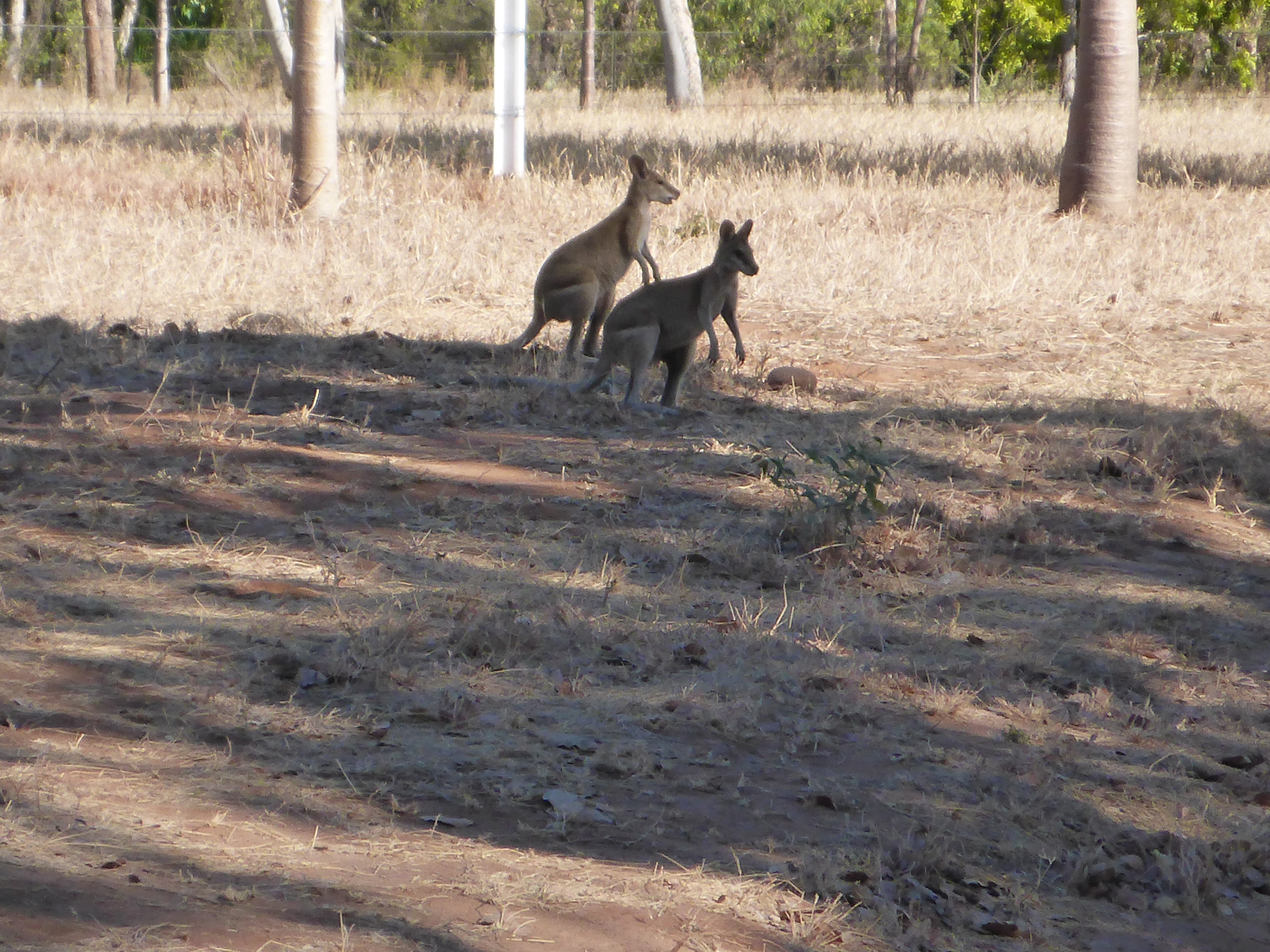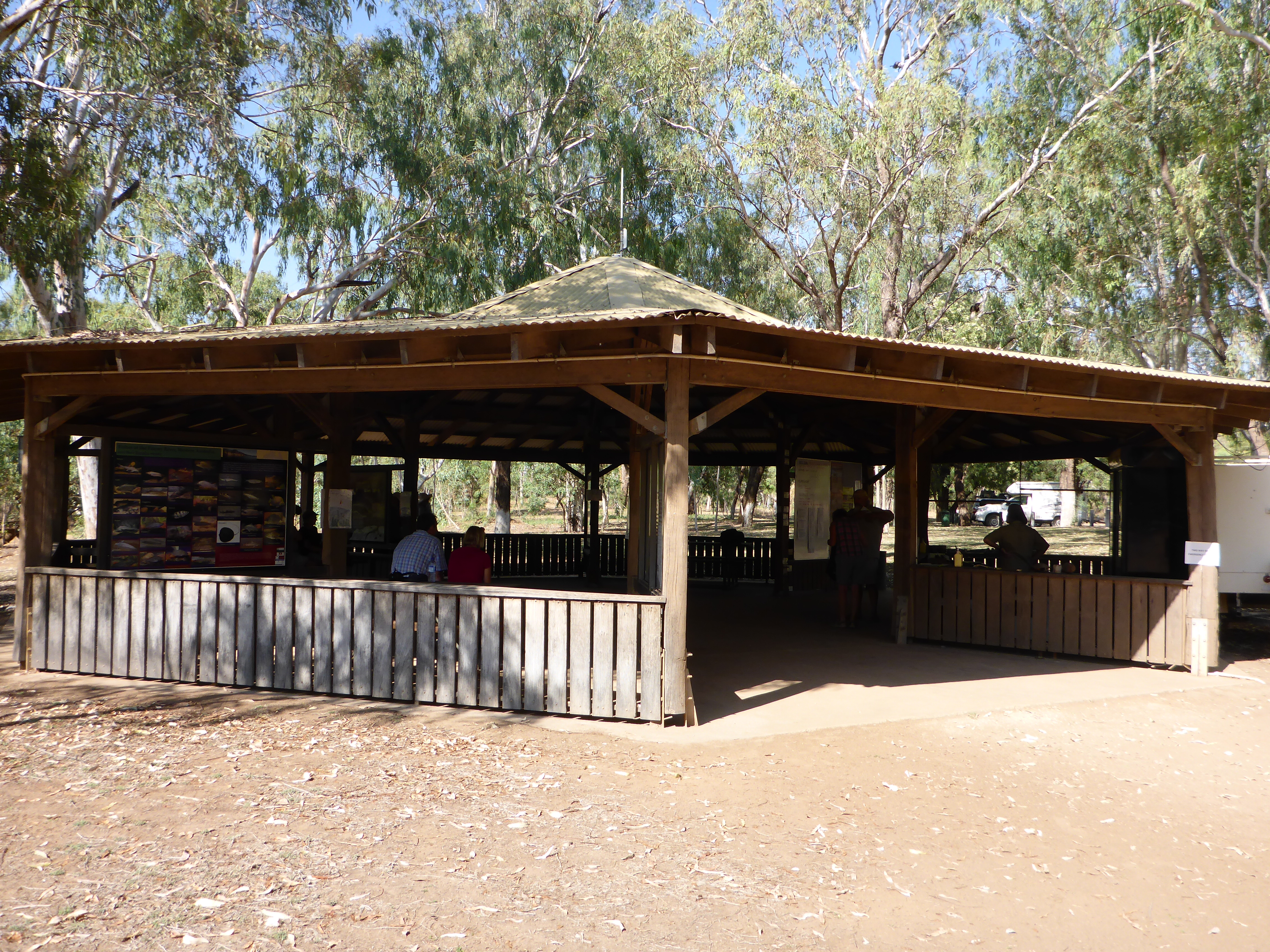 Another 70kms of dirt and 45kms of bitumen got me to Fitzroy Crossing and to Fitzroy Lodge, easily the swankiest camp site I’ve been on so far. It’s also a rather expensive hotel/motel and has a nice, cool swimming pool. Once my tent was up I took advantage of it. Hanging around the pool was a bird. A Cookaburra, in fact. It is a member of the Kingfisher family and looks very much like one too. I also met an English couple, Malcolm and Margaret, from St Albans. They’re enjoying a holiday and had been to see some of the Gibb River Road’s sights as well.