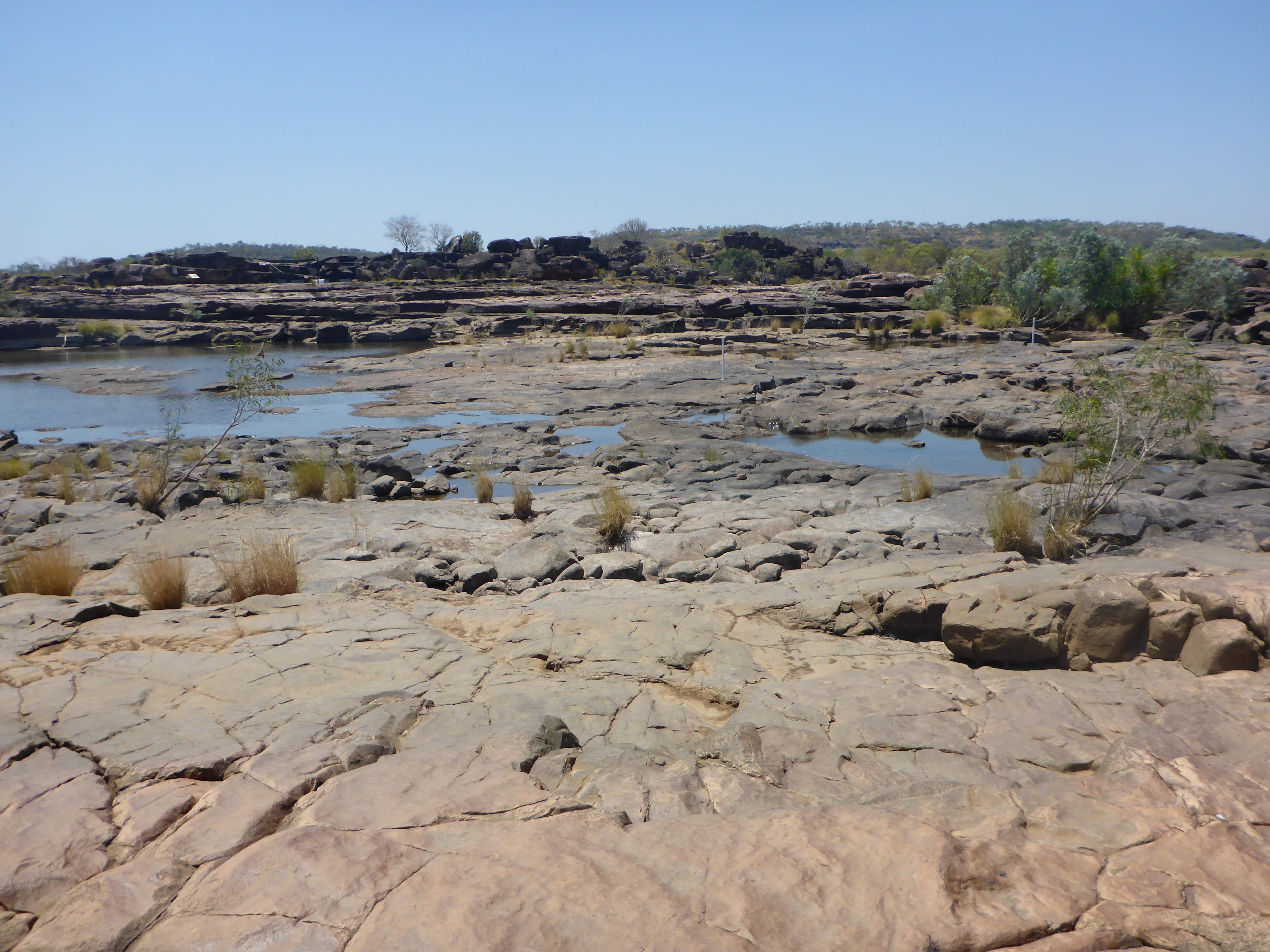 I got down to the visitors’ car park fairly early next morning, before the heat had risen too much. I set off to walk out to the falls. Not difficult at first but soon the well marked trail had me scrambling over rocks and round boulders. It was well worth the effort though. Little Mertens Falls comes first. Hardly any water flowing but they are far from little, with a long drop into a deep pool. Next to them is a nice lilly pool and it looked very refreshing. Onwards to the main event. The Mitchell River is very wide just above the falls and is easy to cross in the Dry. There is a heli-pad on the far side so you can walk out and get flown back, if you want to and can afford it. I didn’t and couldn’t.