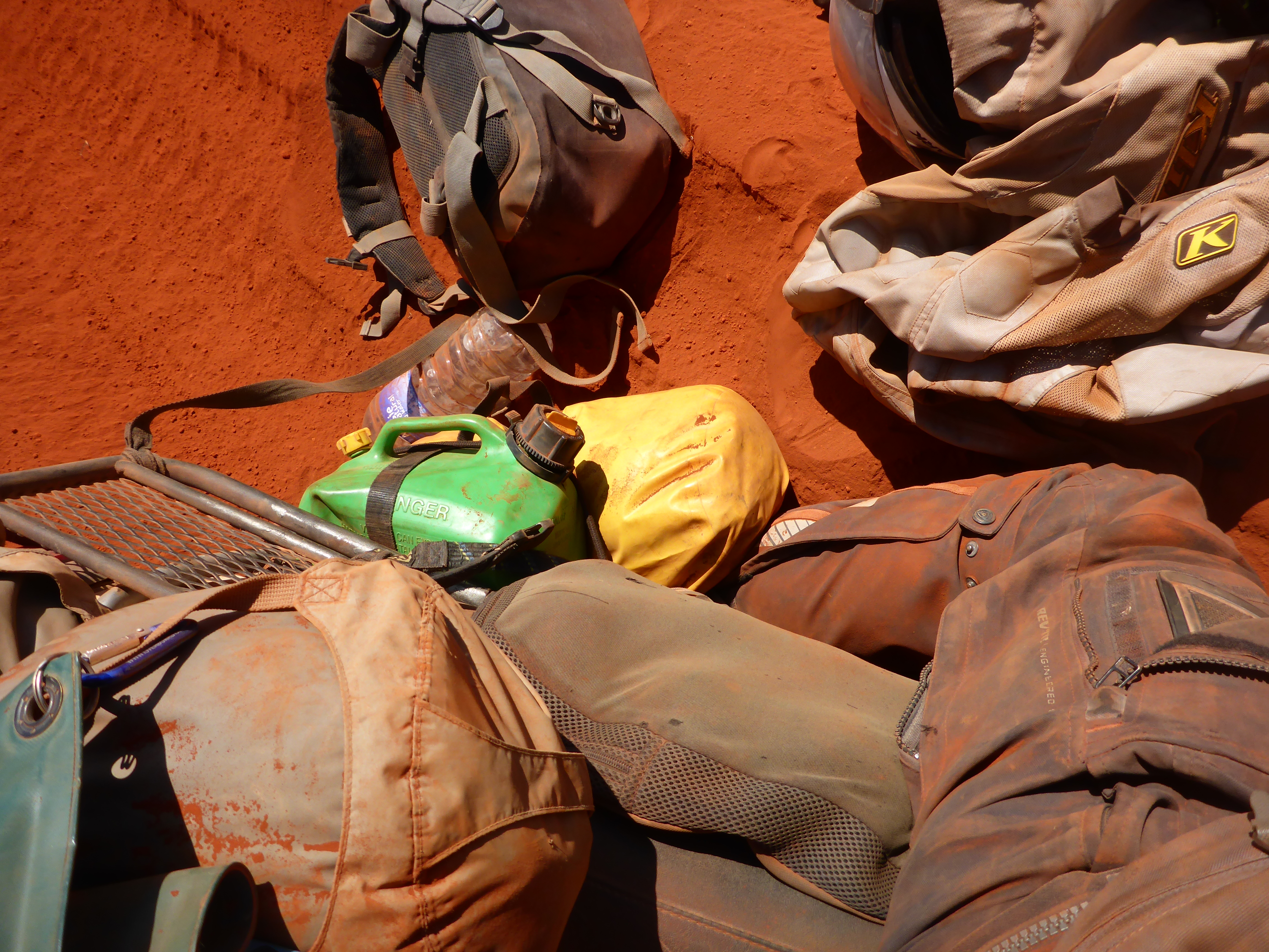 All good to go, so I set off for Windjana Gorge, about 375kms of dirt road and another good sized step westwards along the Gibb River Road. My return ride up to Mitchell Falls had increased my confidence on the dirt roads. Where I used to slow down a bit, ‘just in case’, I was now keeping the throttle open and just powering through the rough patches. Unfortunately I’d forgotten about sand so, needless to say, when I came to a 100 metre long section of red sand, perfectly blended into the red road surface, I was going too quickly to deal with it. It dealt with me instead and in no time at all I was lying down and eating dirt once more. In case you wondered, all sand tastes the same. Once more I was taken back to my time in Mongolia because my left leg was trapped under the pannier with the full weight of the bike on it. My ankle and knee were twisted round a bit, making movement painful. I un-shipped my luggage from the rear rack but it didn’t help. I was trying to use the handlebars and front wheel to twist the bike up and maybe take enough weight off my leg to let me slide it out. No go. Eventually the solution was to get my right leg across the bike to the left side, which enabled me to reach back and dig my foot out of the sand. I was free. And it surprised me that once I’d stood up and eased the strain in my knee it stopped hurting.