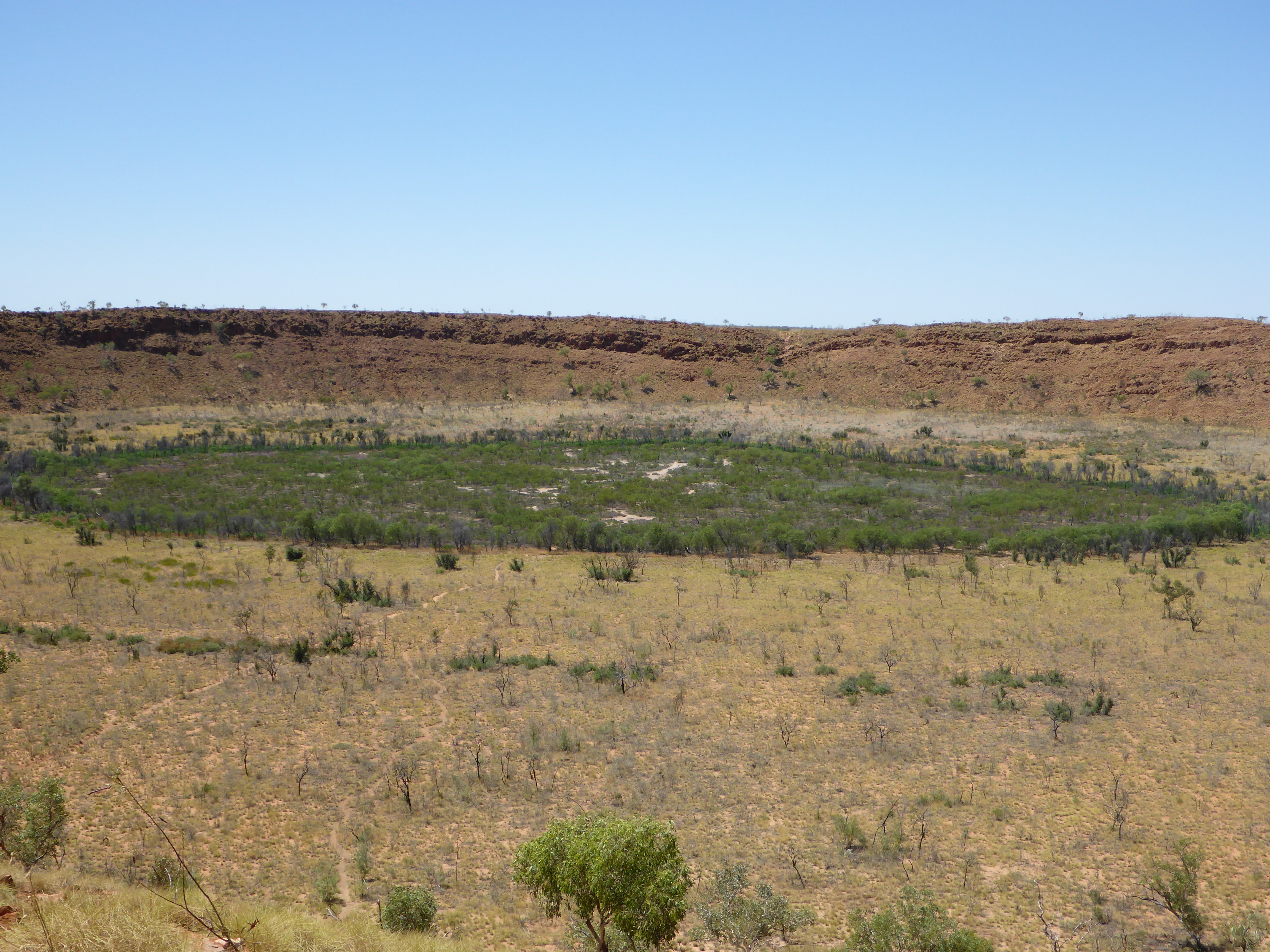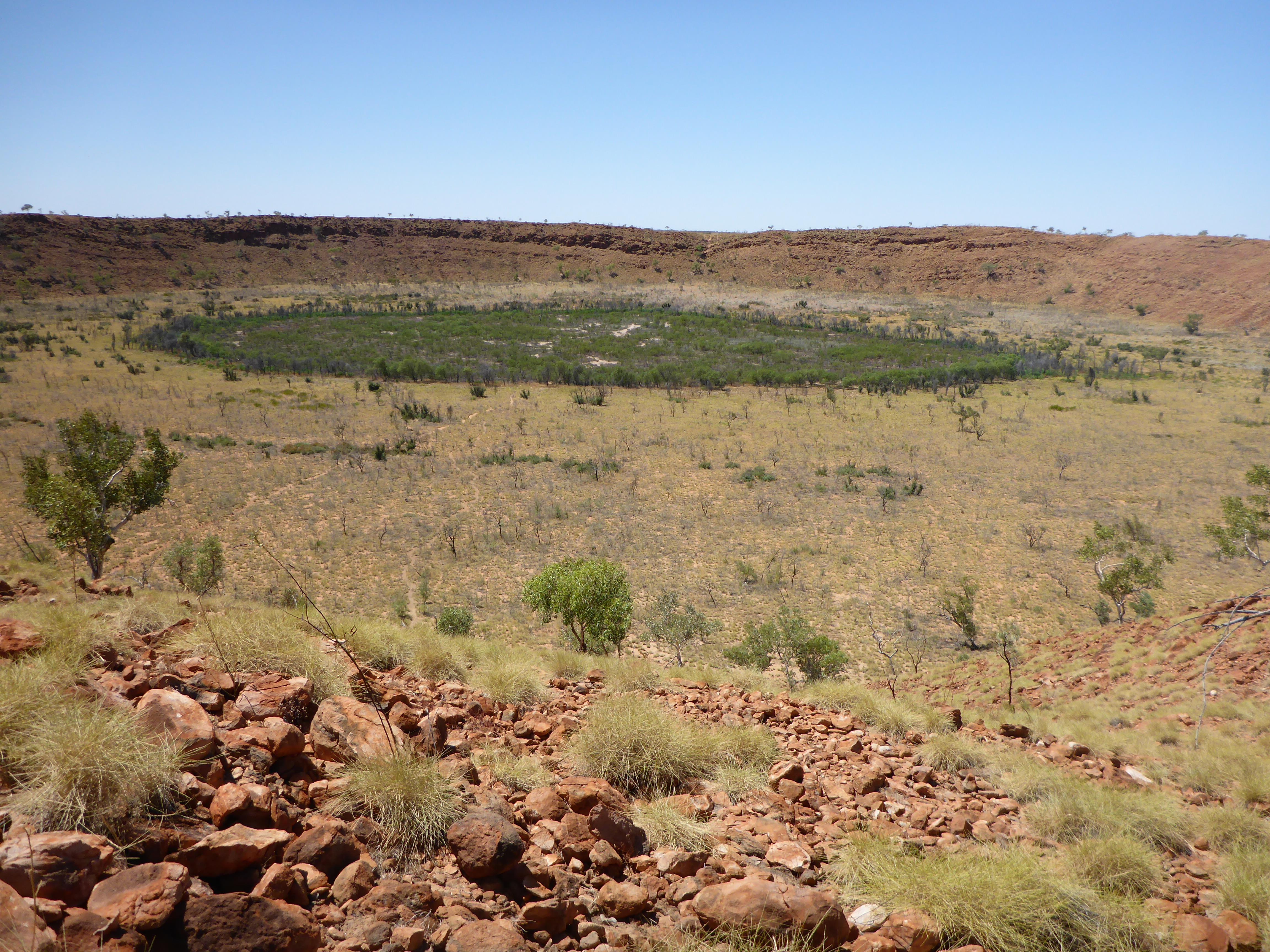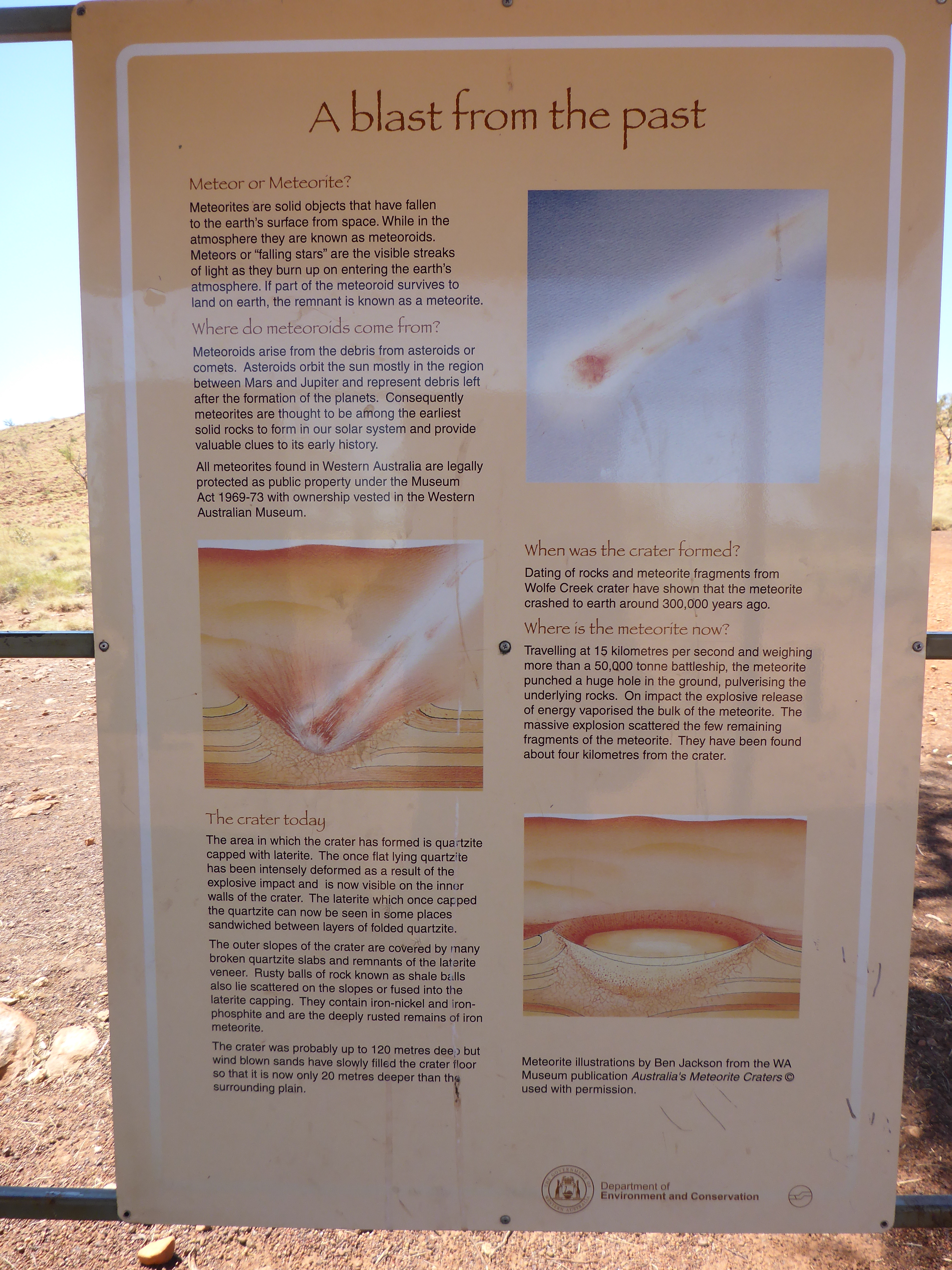 Wolfe’s Creek Meteorite crater is an amazing place. It was formed about 200,000 years ago when a large meteorite landed. The crater is about 900 metres wide and was originally about 120 metres deep. Since then it’s filled up with sand to the extent that the bottom is now about 20 metres below the level of the surrounding plain. The effect of the rim is to make it look far deeper. It’s the world’s second largest, the biggest one being in Arizona.