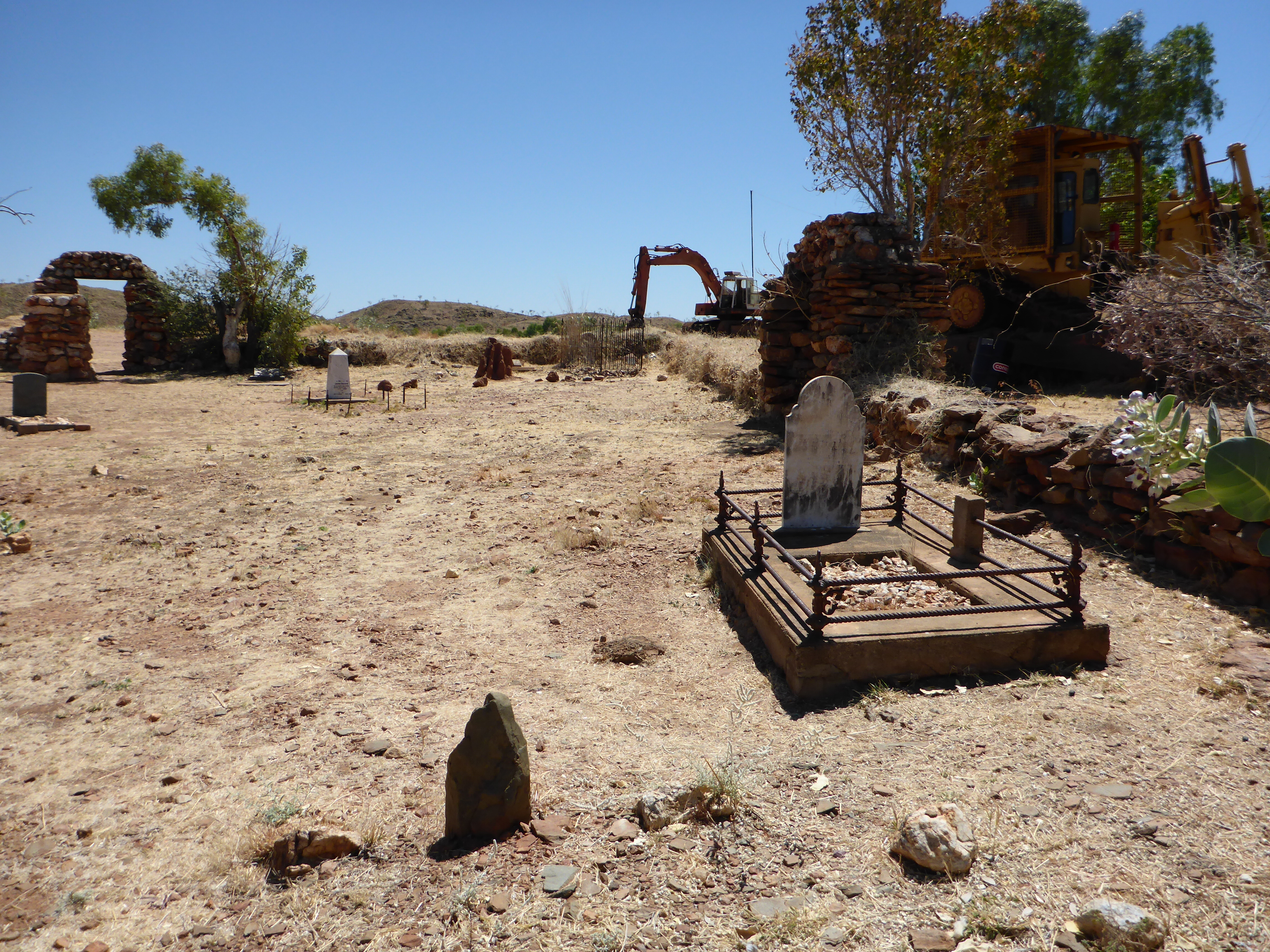 There isn’t much left of the old town. The only building still standing is the Post Office. It’s now been fenced off to protect it but a fair amount of the original walls are still standing, including a rather nice looking fireplace. The building material which has stood the test of time so well is crushed termite mounds. The walls were made of mud slabs and the mud was made from mounds mixed with water. This method was very common, especially for making floors. Let’s be honest, there’s no shortage of raw material. The other buildings have all gone but there are markers to show where they stood. The cemetery is still there though, always worth a walk around. It’s surrounded by disused trucks and other machinery, although I’m not sure whether that was deliberate or coincidental. Rest in peace and rust in peace.