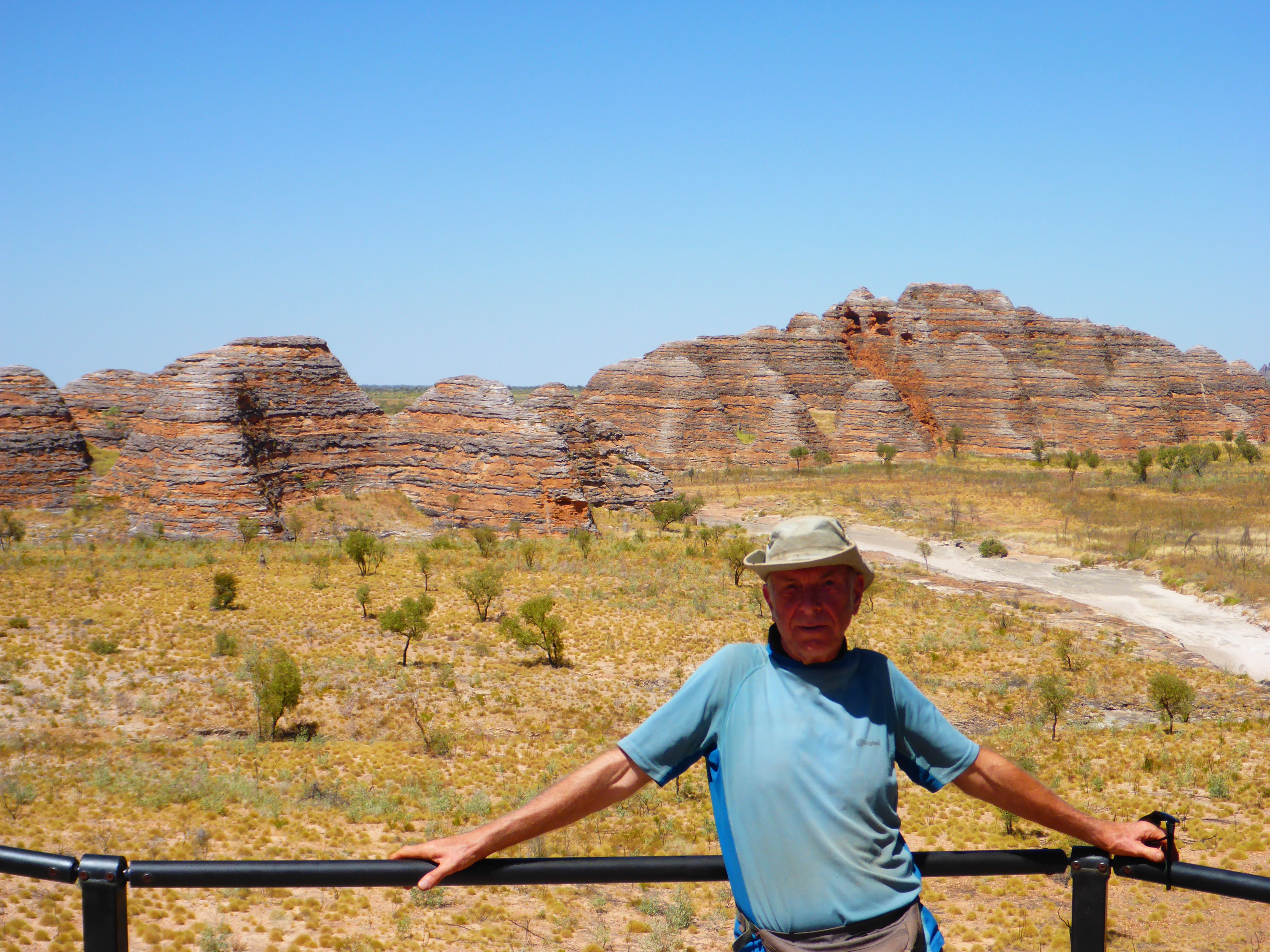 My shoulder felt fairly good, everything was repaired, time to move on. Not far though. 150kms northwards lies the Purnululu National Park wherein can be found the Bungle Bungles Range. About 360 million years old, it is noted for its geological splendour. For the last 20 million years the effects of erosion have been working on the landscape and have left an incredible legacy of gorges, domed, multi layered hills and a series of rivers. The park has World Heritage status and getting around has been made easy, as access tracks to all the best areas are provided. This network of roads and paths is well signposted and has plenty of info boards. The Bungle Bungle Range is renowned for its banded domes, the worlds most exceptional example of cone karst formations. The bands occur when cyanobacteria grows on layers of sandstone where moisture accumulates. The orange colour is oxidised iron compounds which have dried out too quickly for the bacteria to grow. Erosion has done the rest.