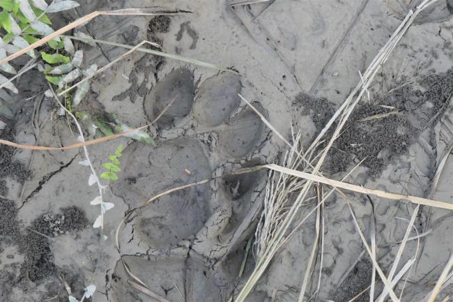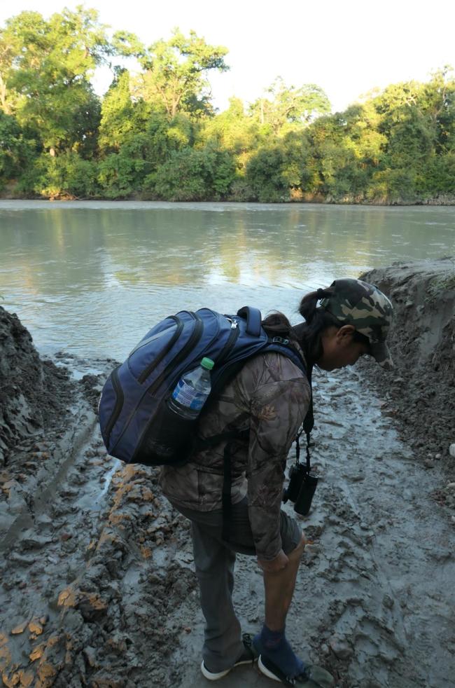 Meanwhile Drusilla was explaining to me how to escape from any of the big beasts we might come across, should we need to. For the record: if it’s a rhino, climb a tree; if it’s an elephant, run; if it’s a tiger, hit it on the nose with your stave and try to protect your neck because that’s where they like to attack. I wasn’t sure whether or not any of this reassured me, but I figured the chances of attack to be so low that it didn’t matter much anyway. She pointed out some tiger dung, which they use to mark their territory, a tiger pug, some claw marks on a tree and some elephant footprints, which are HUGE! They probably came from one of the working elephants we’d seen earlier in the day, which are used by the park rangers.