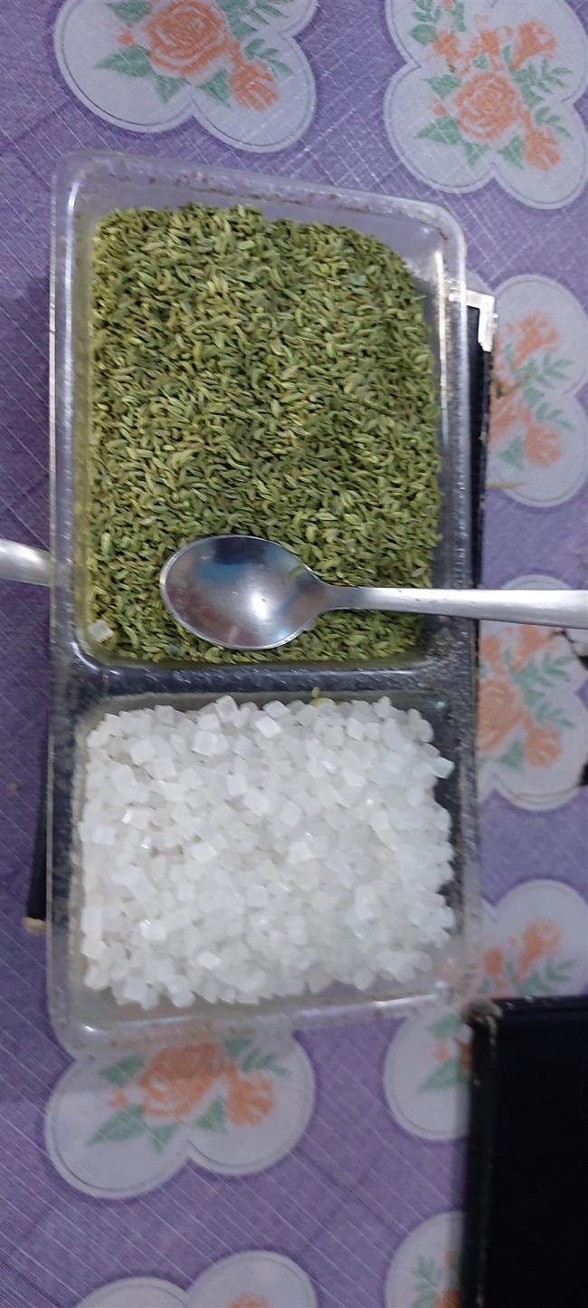 In all but the cheapest eating places you will be brought this dish, along with the bill. Sugar crystals and aniseeds are a great way to freshen up the mouth.