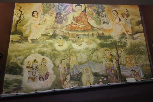 Another steep set of steps took me up to the temple, finely decorated on the outside. Inside the walls were covered in typical temple artwork, with paintings illustrating various scenes from Buddhist stories. The Buddha statue that sat on top of the temple was massive, in contrast to the one inside, which was quite small. But with everything painted gold, it all came across as very impressive.
