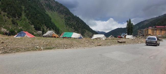 The next morning brought more of the same kind of views. I was still riding along the valley, at an elevation of about 3,000 metres. Snow melt gifted me more rushing water to wrestle the bike across and the consequent challenges to enjoy. The mountain grass was green and inviting, especially to the herds of goats I saw being driven along the road. There were at least ten separate herds and small tent villages set up between the road and the river to accommodate the herders. Thinking back I remembered see several heavily laden pick up trucks struggling up the mountain road. Tents, bedding and utensils, all topped off with kids. They’d clearly been heading to there. They are from the Gujjars, and other tribes, who come there for the summer pasture.