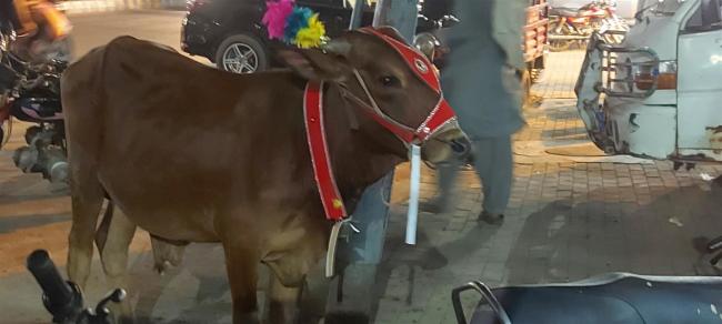 When we walked back we saw various animals tethered in the side streets, ready for Thursdays events. I asked Malik about cost and he reckoned a decent bull would cost about 1.2 lac rupees (about £340). A sheep would be 0.8 lac (about £225) and so on down the scale of size. This takes place every year. I don’t know what pressure there must be on families to buy the biggest animal they can, but it seems to me to be quite a high financial burden on the poorer ones. But given that the meat is shared out, maybe the cost is shared too. I’m not sure how I feel about the whole thing to be honest. I eat meat and accept that animals get killed for that, but it’s the idea of the ritual slaughter that I don’t feel very comfortable with.