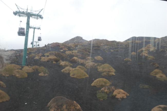 The guide walked us across to the edge of one of the slopes and showed where the lava had flowed down the hill previously. Quite boring really. With the disappointment of not going to the top added to the wind and rain, I was quite pleased when we headed back to the bus. It should have dropped us off to catch the cable car but that service had been suspended because of the high wind. I wasn’t surprised.