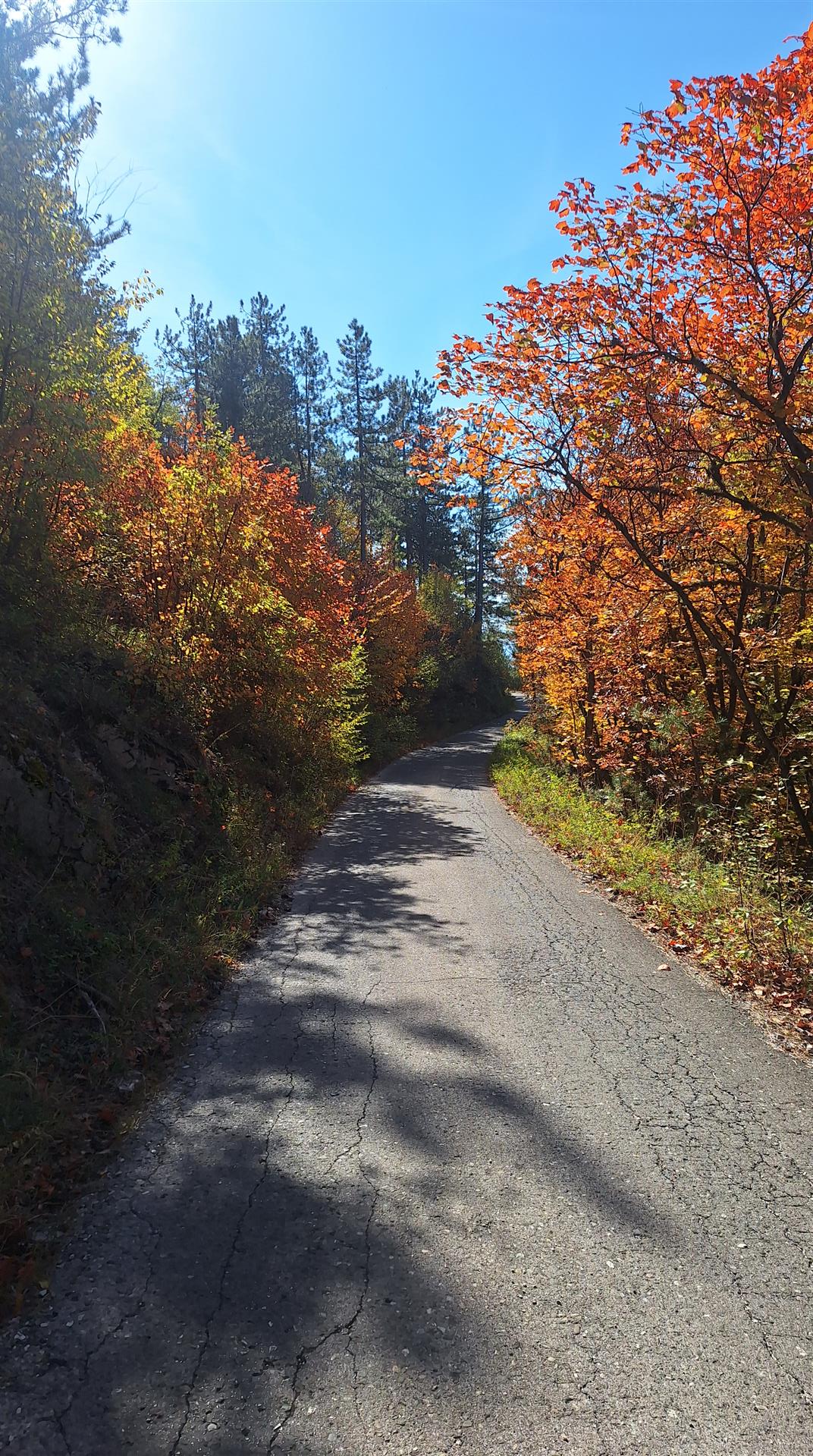 When allowed to go I followed a car up the road and very quickly realised why they only allowed one way traffic. The road was only wide enough for one vehicle. Not even me and a car could have passed each other. It was very steep and twisty, and was quite a challenge. Fortunately the surface was mostly good. I took it easy and enjoyed the autumn colours as I passed through the trees.