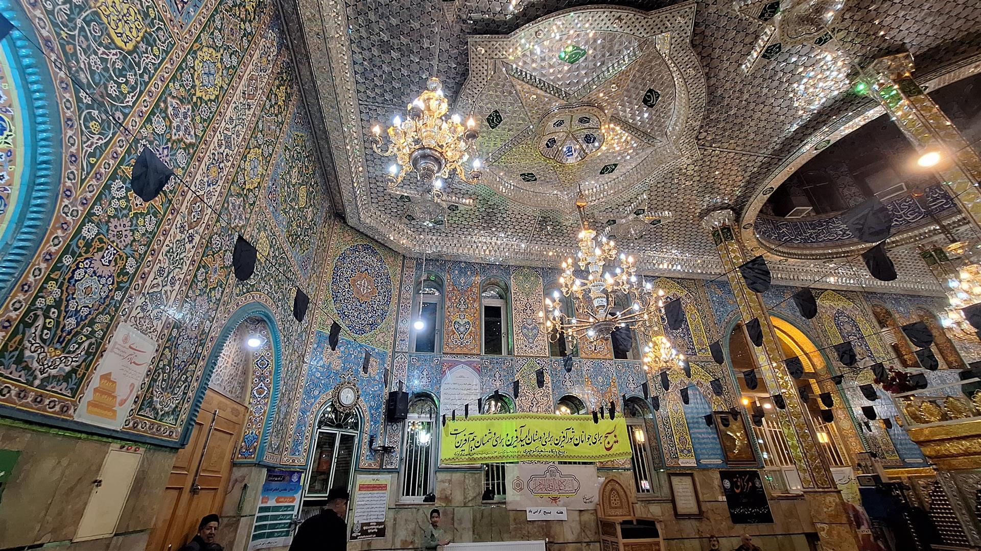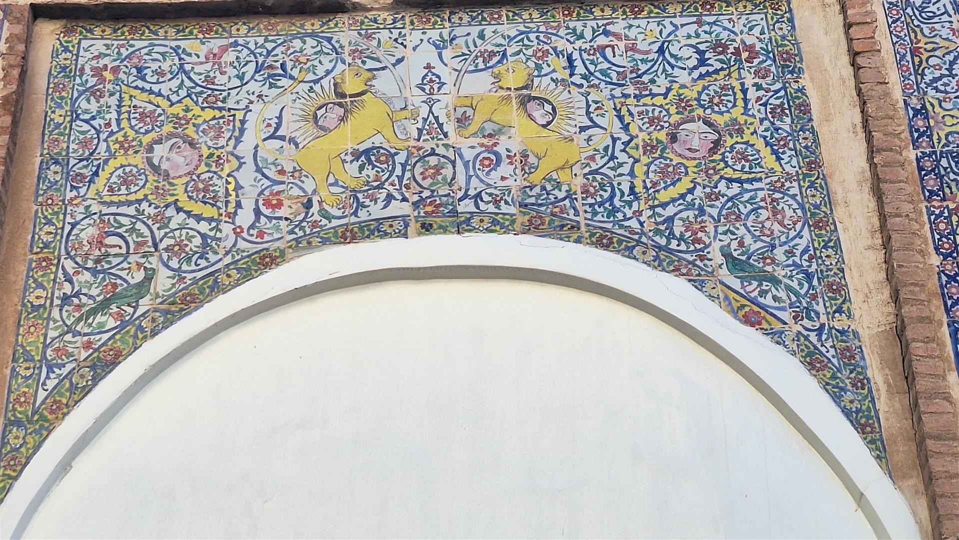 I went back to the hotel for a rest. Later on Erfan collected me and we went to a beautiful mosque, the Imam Zade Seyed Bahlou. The walls were covered in pieces of broken glass, laid out in patterns and pictures. We went to the small one first, then the larger one.