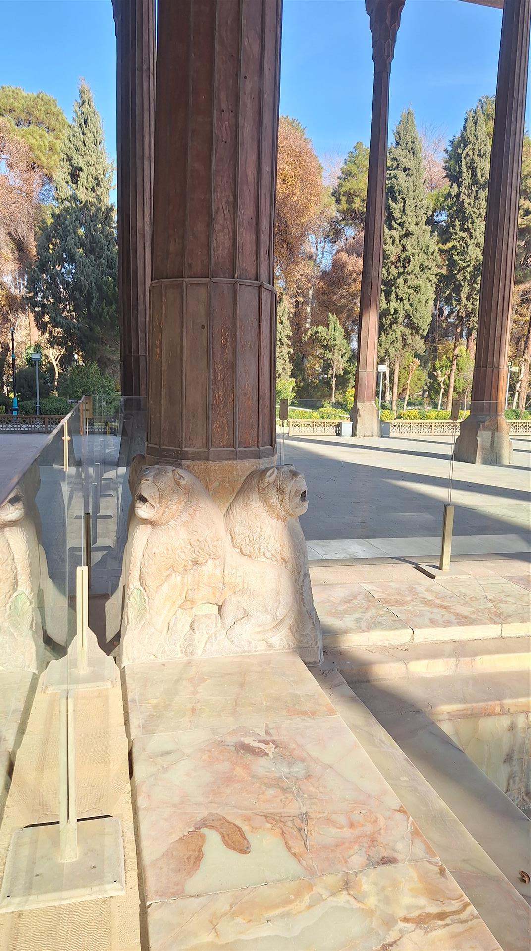 Our first visit was to the Chehel Sotoon Palace. A big place whose main attraction was an open portico area with a roof held up by twenty pillars. They’re made of wood which is covered by thin decorative material. They had carvings of lions at the base. There was some amazing artwork inside. A big pond, surrounded by trees and plants, filled the grounds.