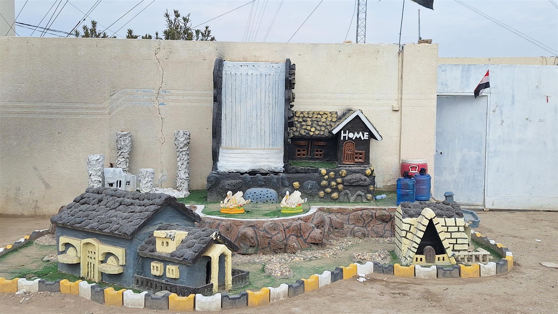 A house and garden, with a wishing well. Some odd looking sculptures of stones seeming to pour out of a tube. Once I’d been examined I asked the soldier if I could photo them. He was quite happy to let me and even insisted on taking some with me in them. A real change from the stern attitude of most checkpoints.