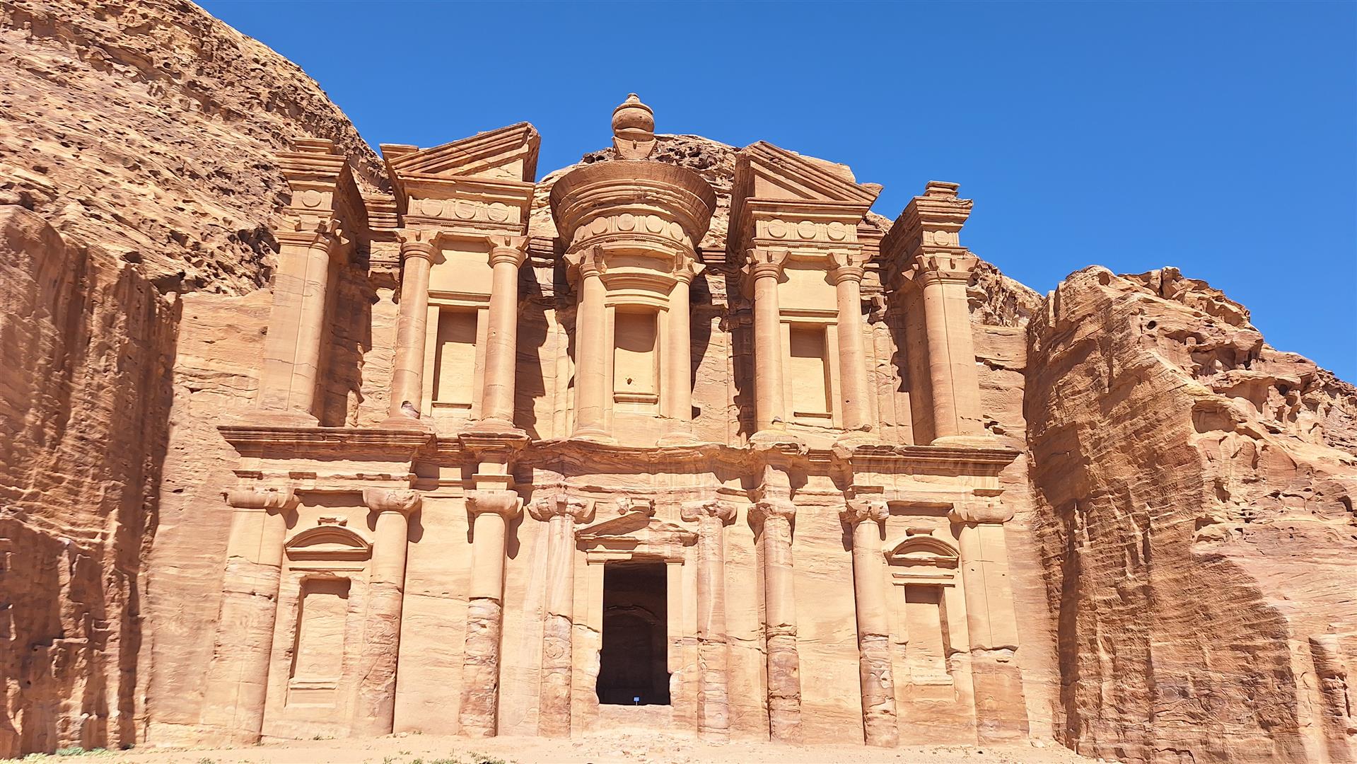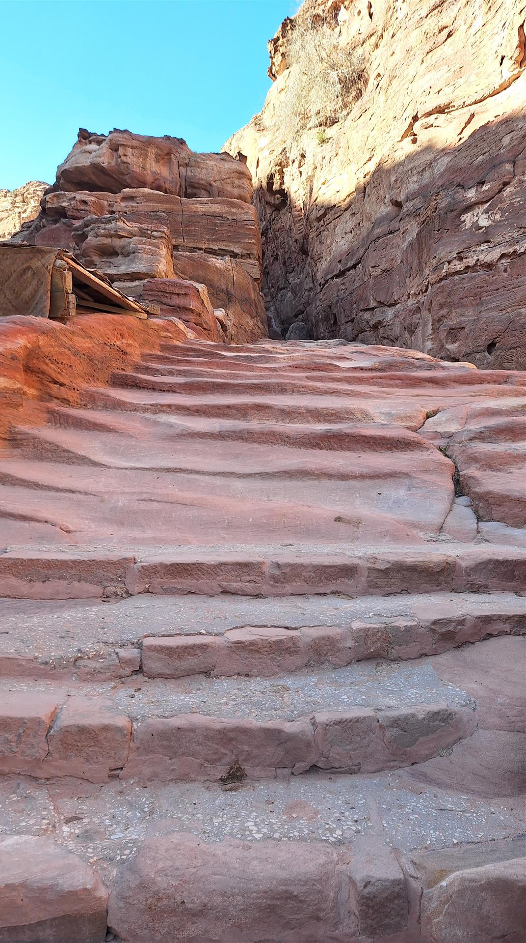 Another great day followed. One of the attractions I wanted to see was Ad-Deir Monastery, high up in the hills. It was accessible from the main area, near the big temples. But it meant climbing up a track, described in the brochure, as ‘Hard’. It involved about 1,000 steps, or more, and a 2.5 km walk. But I’d learned that there was a less onerous route via a ‘back road’. There was a free minibus that went from the visitor centre up to a car park above the main site. From there a paid-for jeep would take me up to the start of the trail.