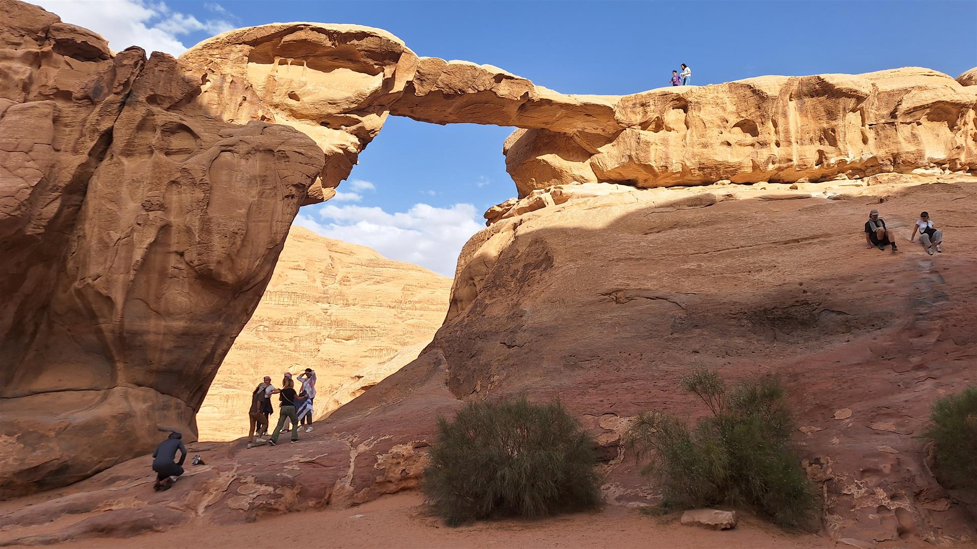 We went to two rock bridges, Little Bridge and Um Frouth Bridge, which were places where the rock underneath had been eroded, forming natural bridges. We climbed up while Awwad took photos of us. The scramble up the rock was a bit hard in places, although the route was well worn. Of course, the view was superb.