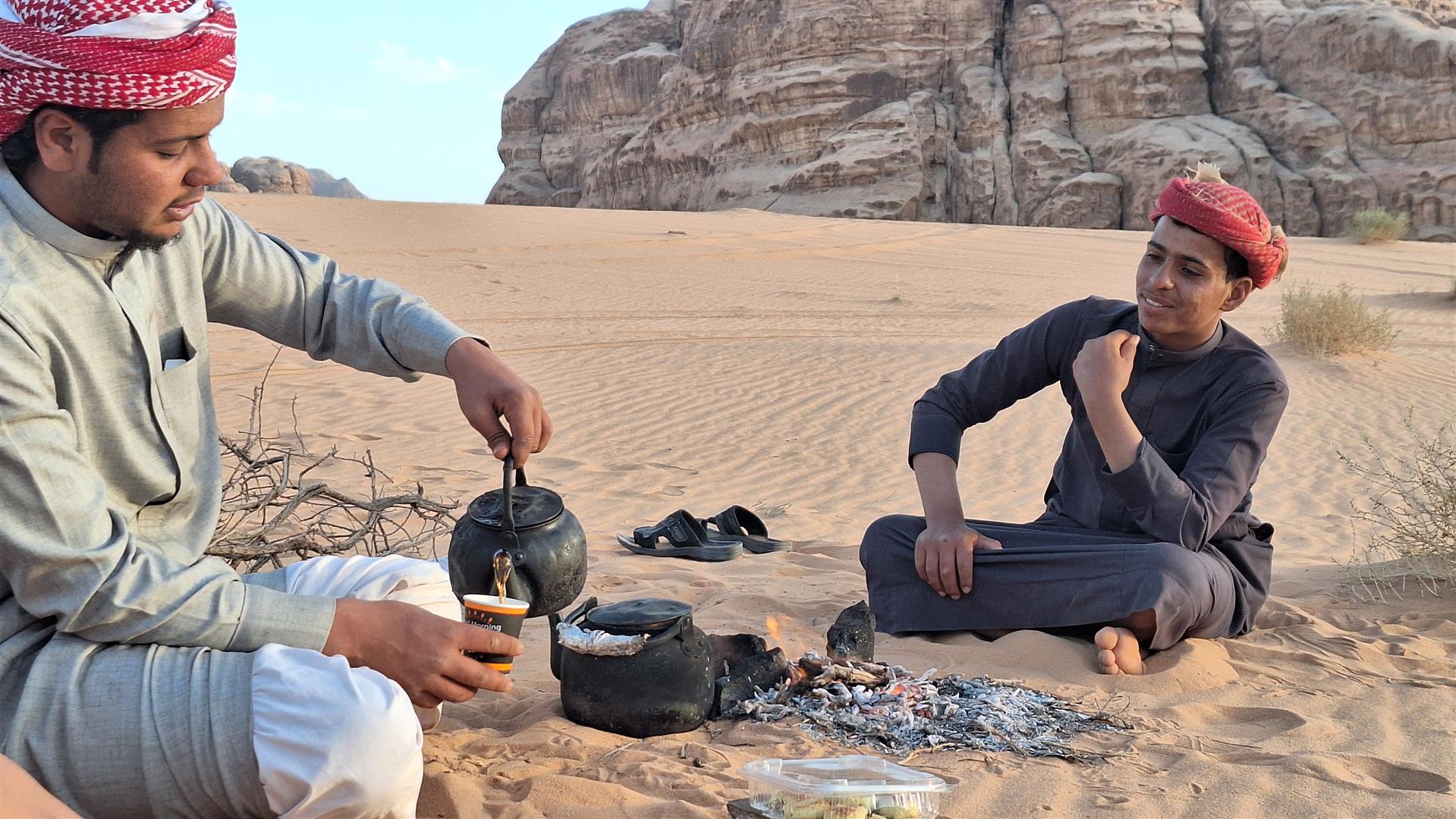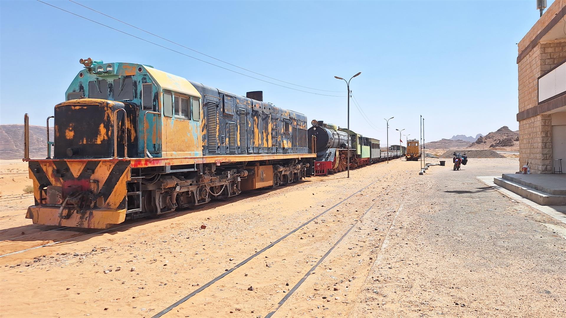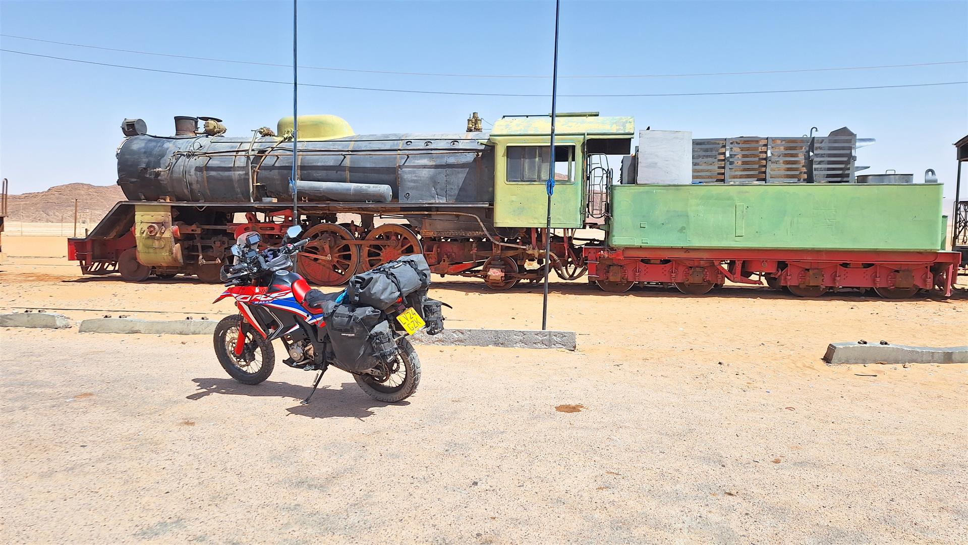 I found the base for Wadi Rum Magic Nature Camp, parked the bike and drank tea. Then I changed into my shorts, ready for the desert. There was a German couple there too but they were going on a train ride. I’d spotted a steam engine on the way in. They told me it runs up the track for an hour, then comes back. It would have been on part of the line that Lawrence of Arabia kept blowing up.