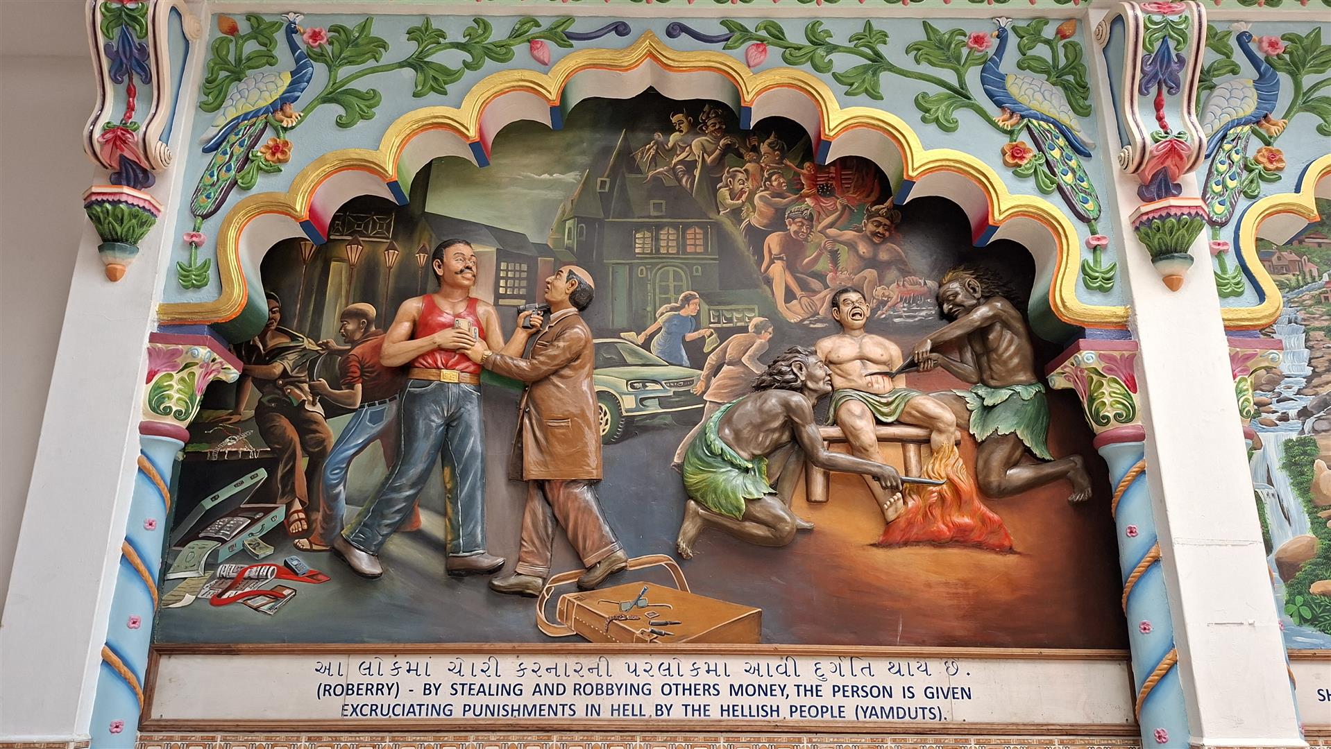I’d lined up some things to do next day so after a good breakfast I stretched the legs and went walking. First was the Shri Cutch Satsang Swaminarayan Hindu Temple. A modern building but with a typically decorative entrance. Inside the main hall were a series of paintings reflecting various morality tales displayed in single picture dramas. Very decorative, in typical Hindu style. Well worth seeing.