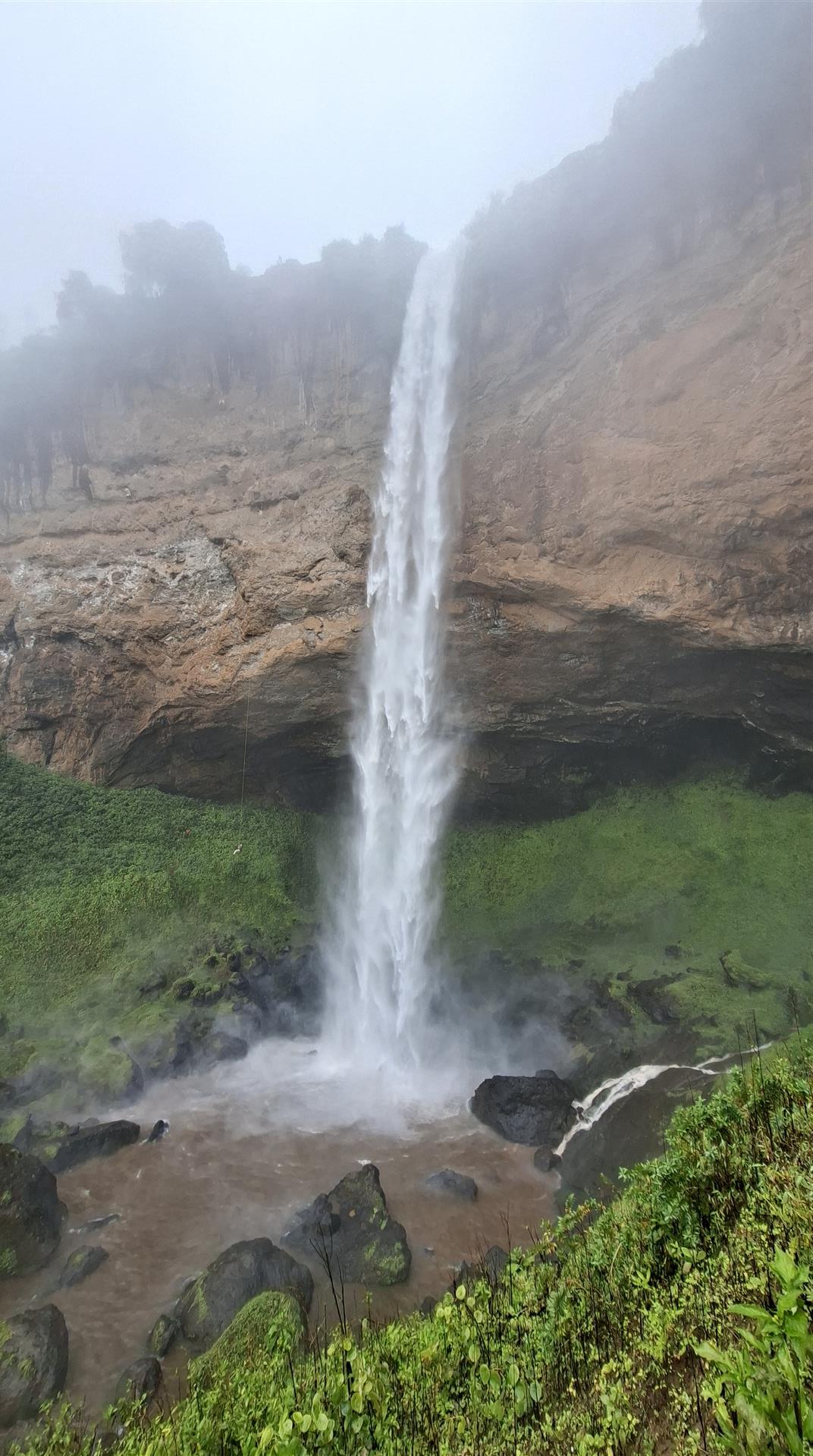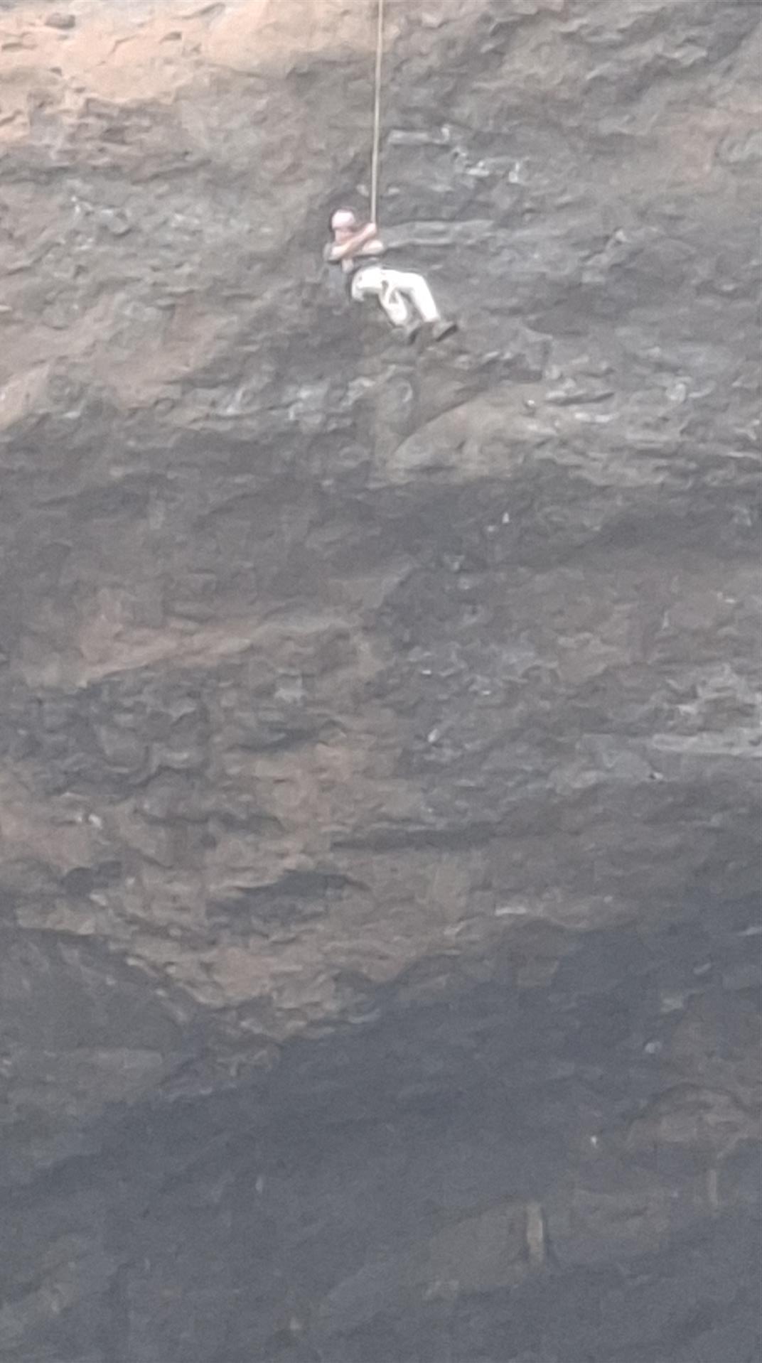 The falls looked great. A straight drop of 100 metres into a pool. There were people abseiling down alongside it too. It was very good.